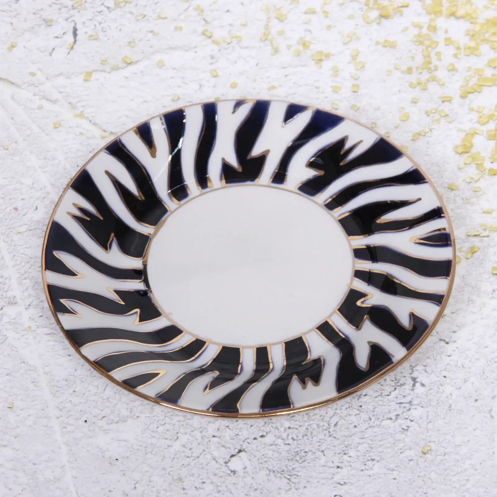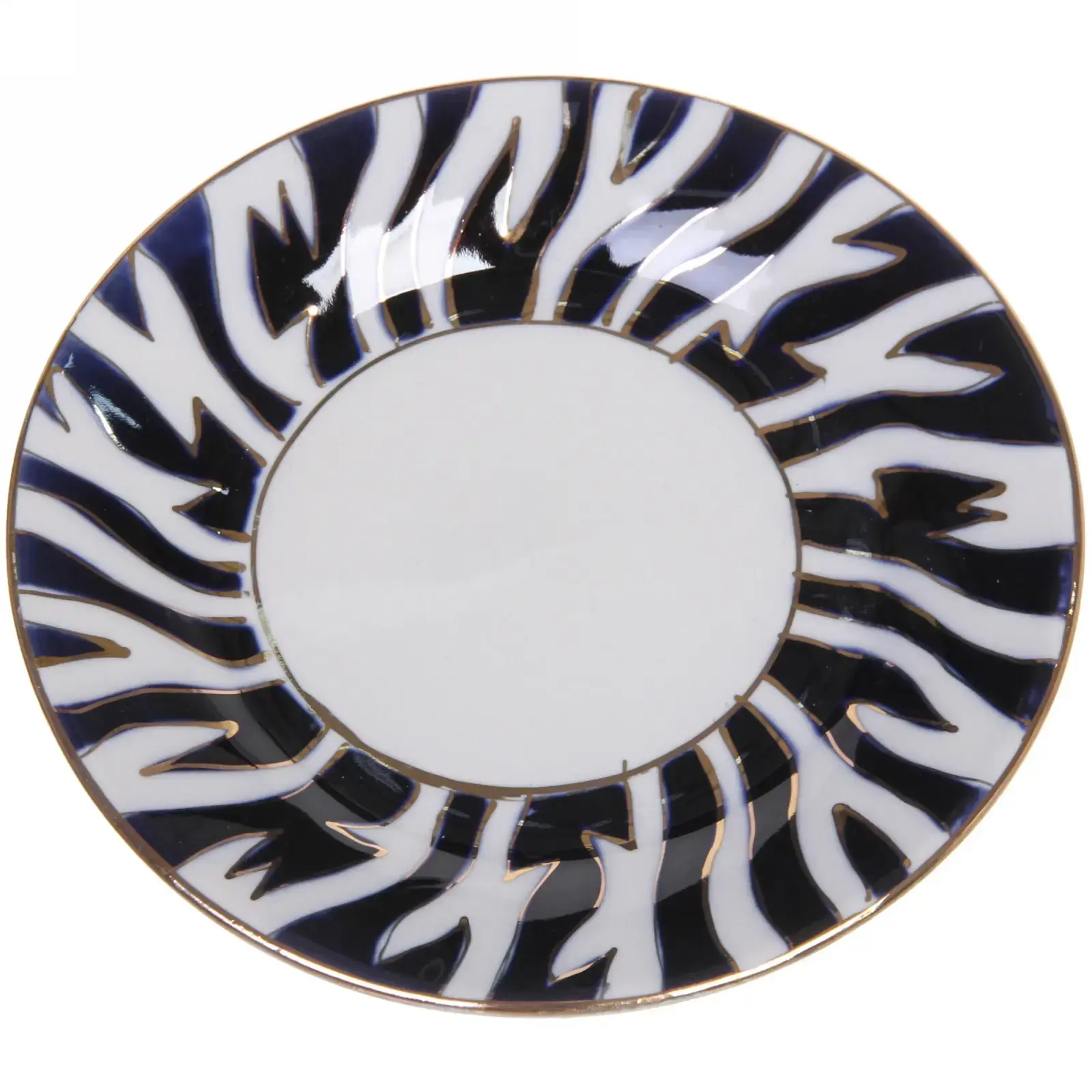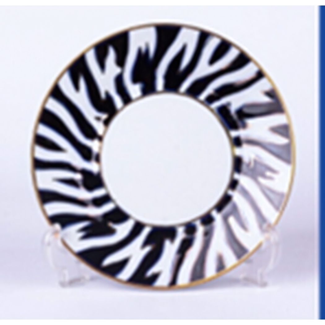 Десертная тарелка «Атлас» сочетает в себе современный дизайн и классическую утонченность. Зебровый узор с золотой окантовкой создает эффектный контраст, превращая обычный прием пищи в эстетическое удовольствие.