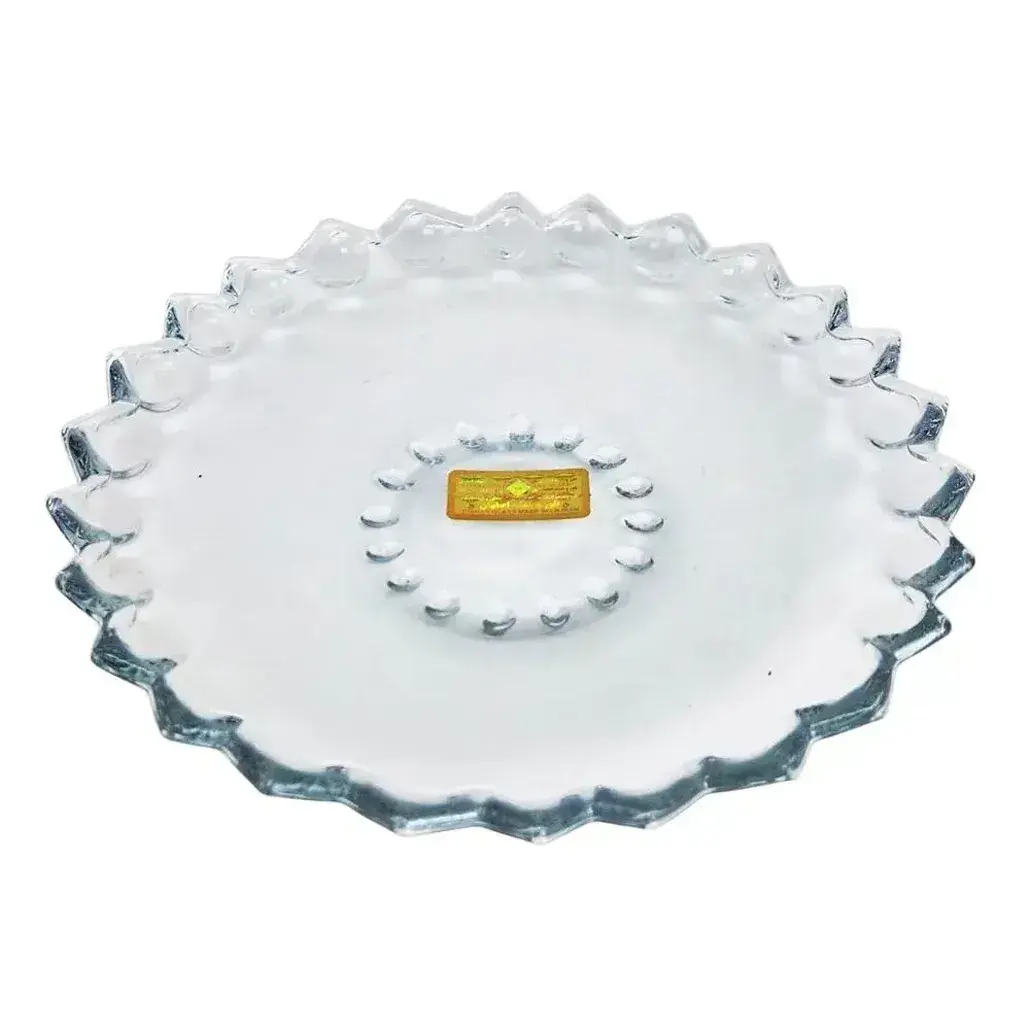 Стеклянная тарелка с рельефным краем и золотистым декором добавит изысканности любой сервировке. Идеально подходит для подачи десертов, канапе или использования в качестве декоративного элемента.