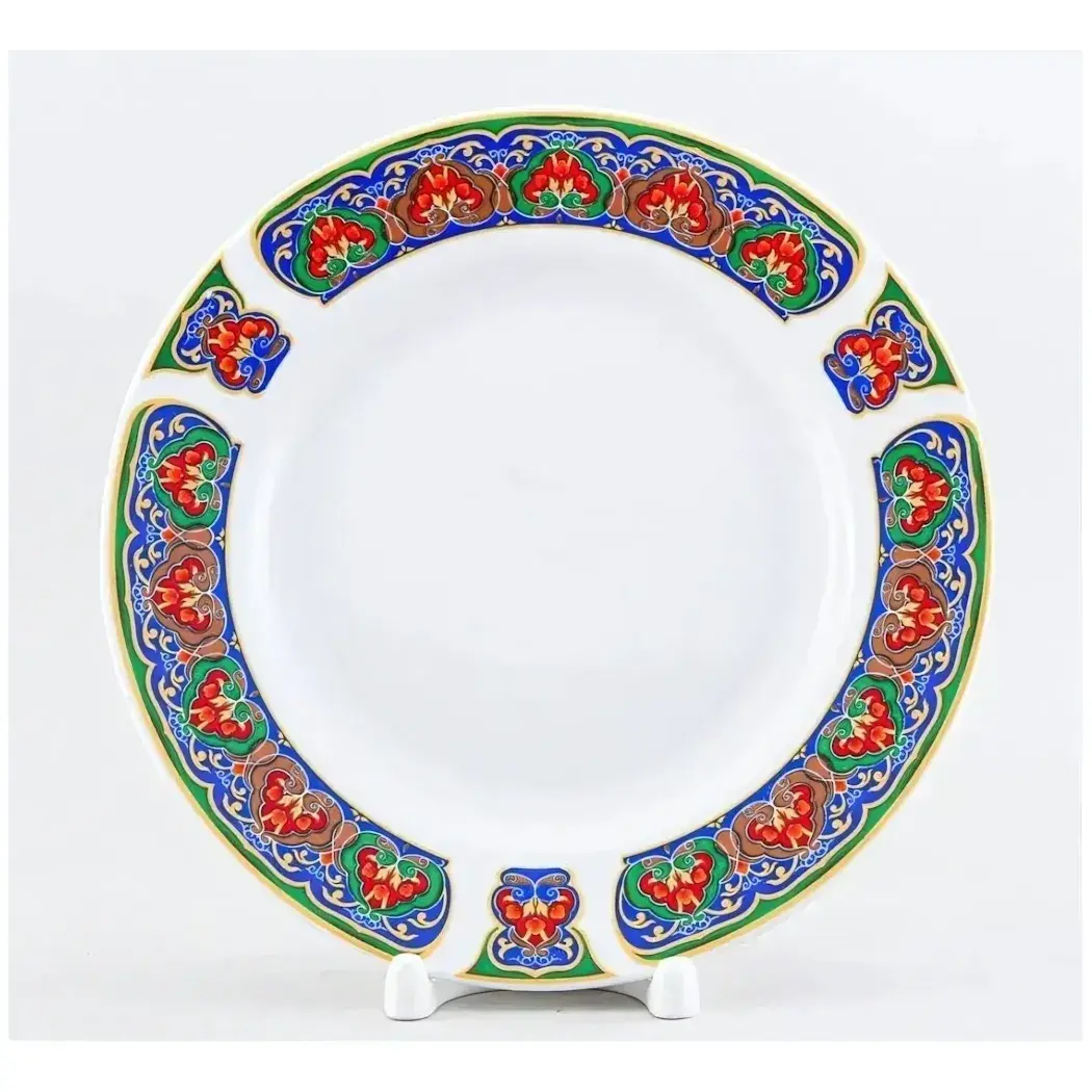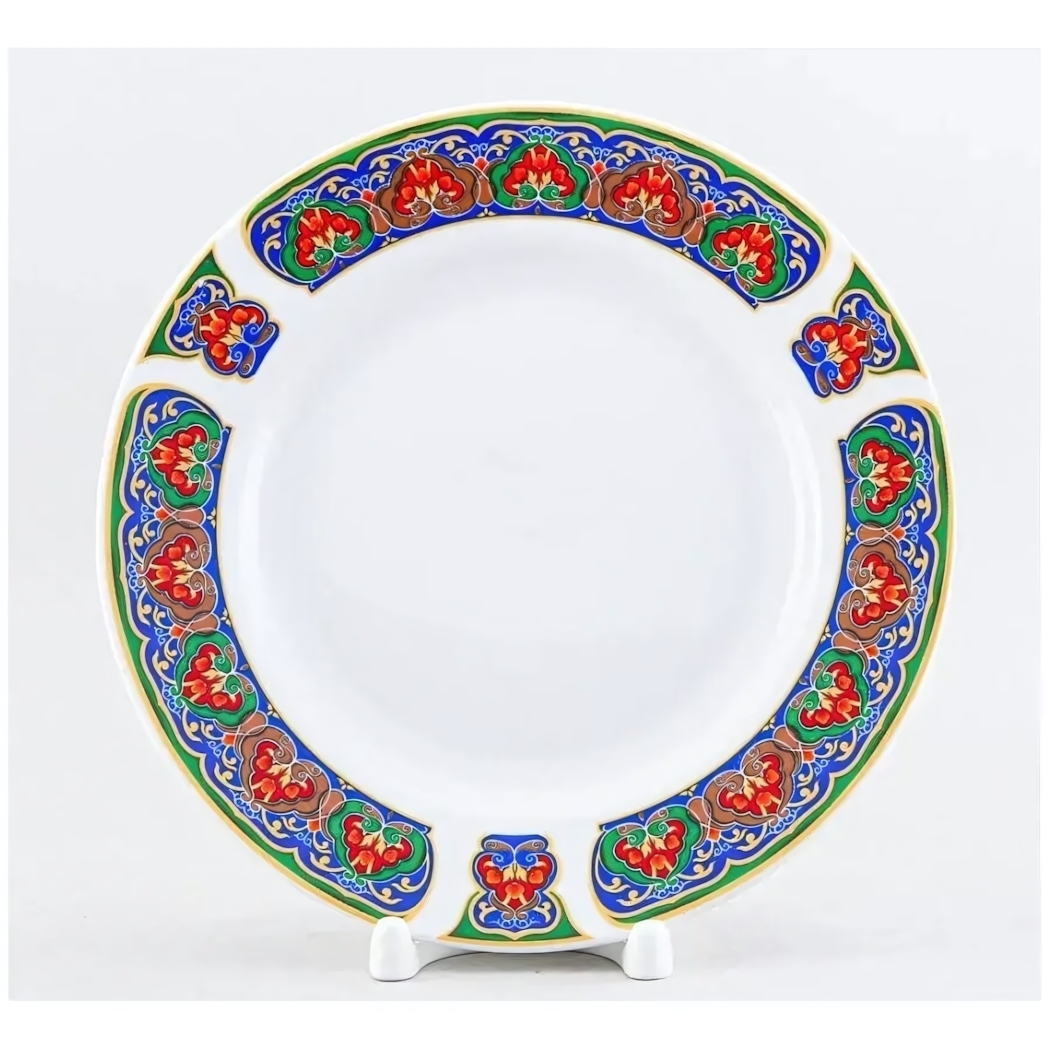 Тарелка выполнена из высокого качества фарфора, обладающего гладкой, блестящей поверхностью, устойчивой к ежедневной эксплуатации. Ее универсальный дизайн и яркий декор идеально подойдут для семейных обедов, торжественных мероприятий или для уютных утренних завтраков. Благодаря классической округлой форме и универсальной цветовой гамме, изделие гармонично сочетается с другими предметами посуды, создавая красивую и практичную сервировку.
