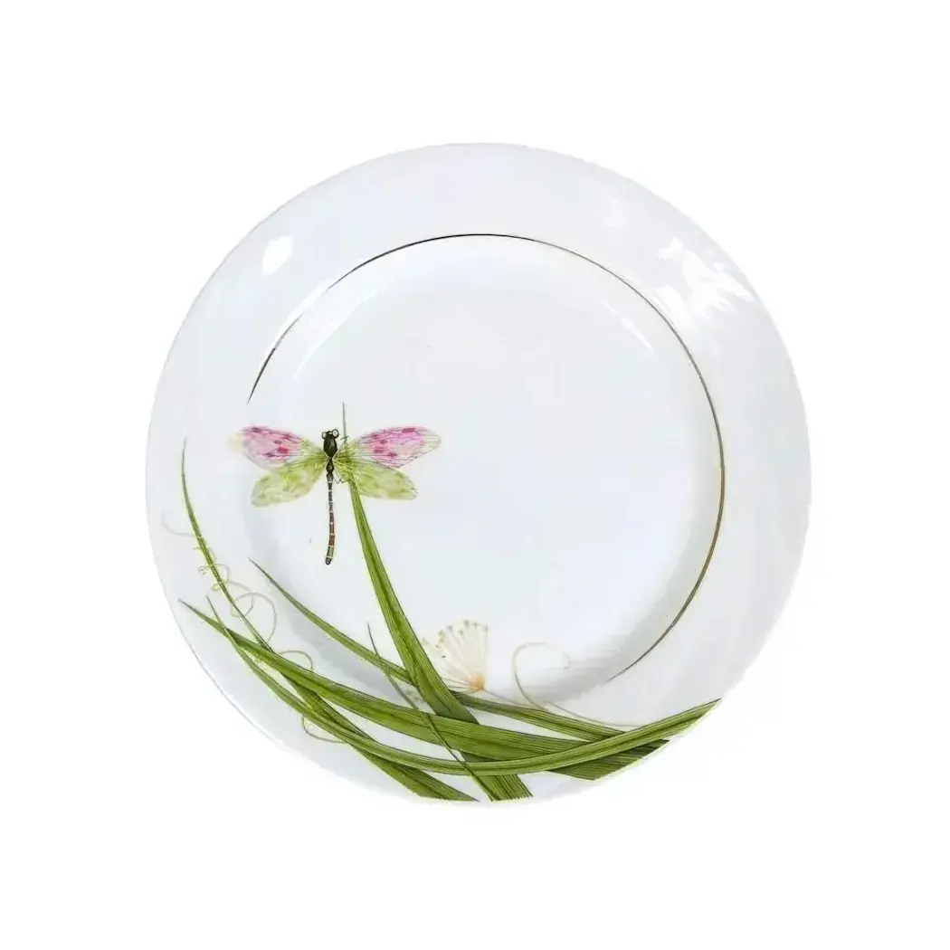 Фарфоровая тарелка с изысканным декором — идеальное сочетание практичности и эстетики. Нежный рисунок стрекозы среди цветочных композиций создаёт атмосферу уюта, а золотистая кайма добавляет нотку роскоши в повседневную сервировку.