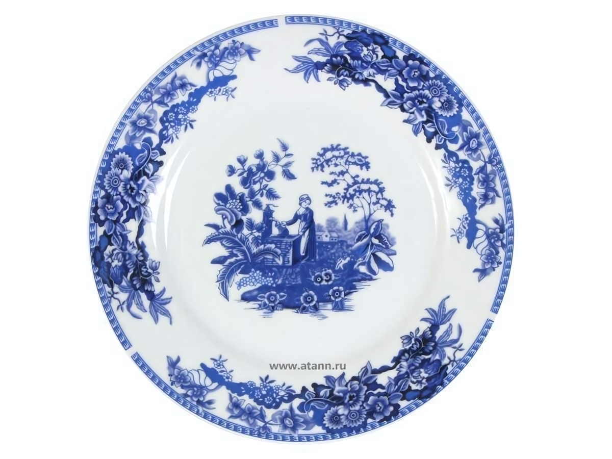 Тарелка обеденная 23см, фарфоровая с синей росписью, цветочный орнамент и сценка