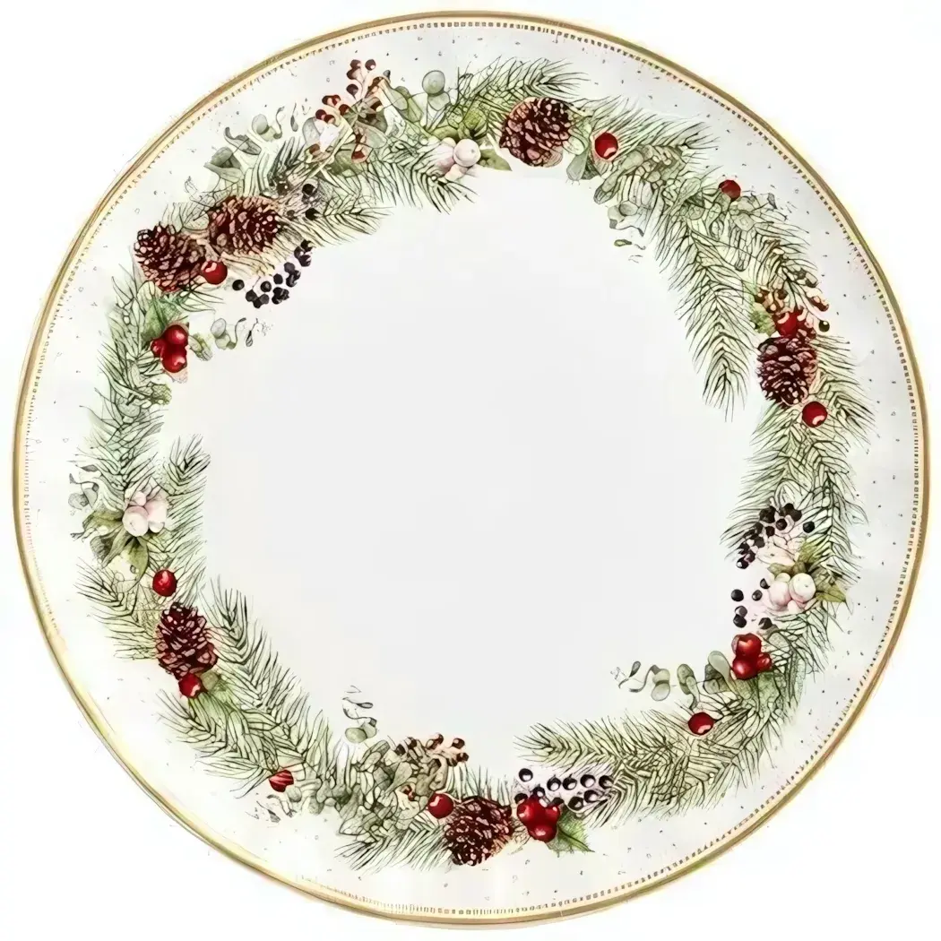 Эта элегантная тарелка создана для того, чтобы ваш стол выглядел торжественно и уютно. Белая фарфоровая поверхность с изысканным декоративным орнаментом в виде новогоднего венка из хвойных веток, шишек и ярких ягод создает атмосферу праздника, а тонкая золотистая кайма по краю добавляет аристократического шика. Посуда из фарфора не только красива, но и долговечна – она сохранит свой блеск и изящный вид на долгие годы.