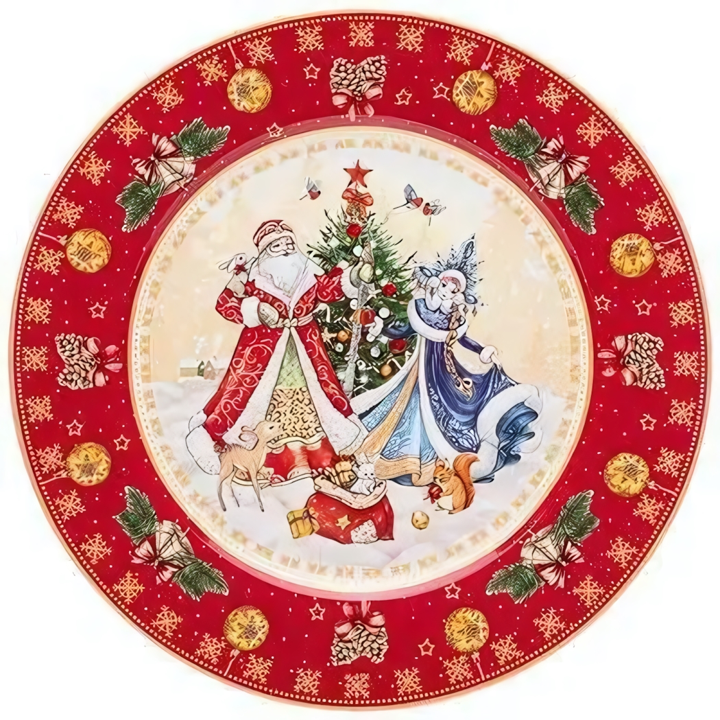 Погрузитесь в атмосферу зимней сказки с обеденной тарелкой, оформленной в красочных новогодних мотивах. На центральной композиции — Дед Мороз в традиционном красном наряде и Снегурочка в голубом платье с меховой отделкой, на фоне нарядной ёлки, подарков и снежного зимнего пейзажа. Яркие детали и насыщенные цвета создают праздничное настроение уже за обеденным столом.