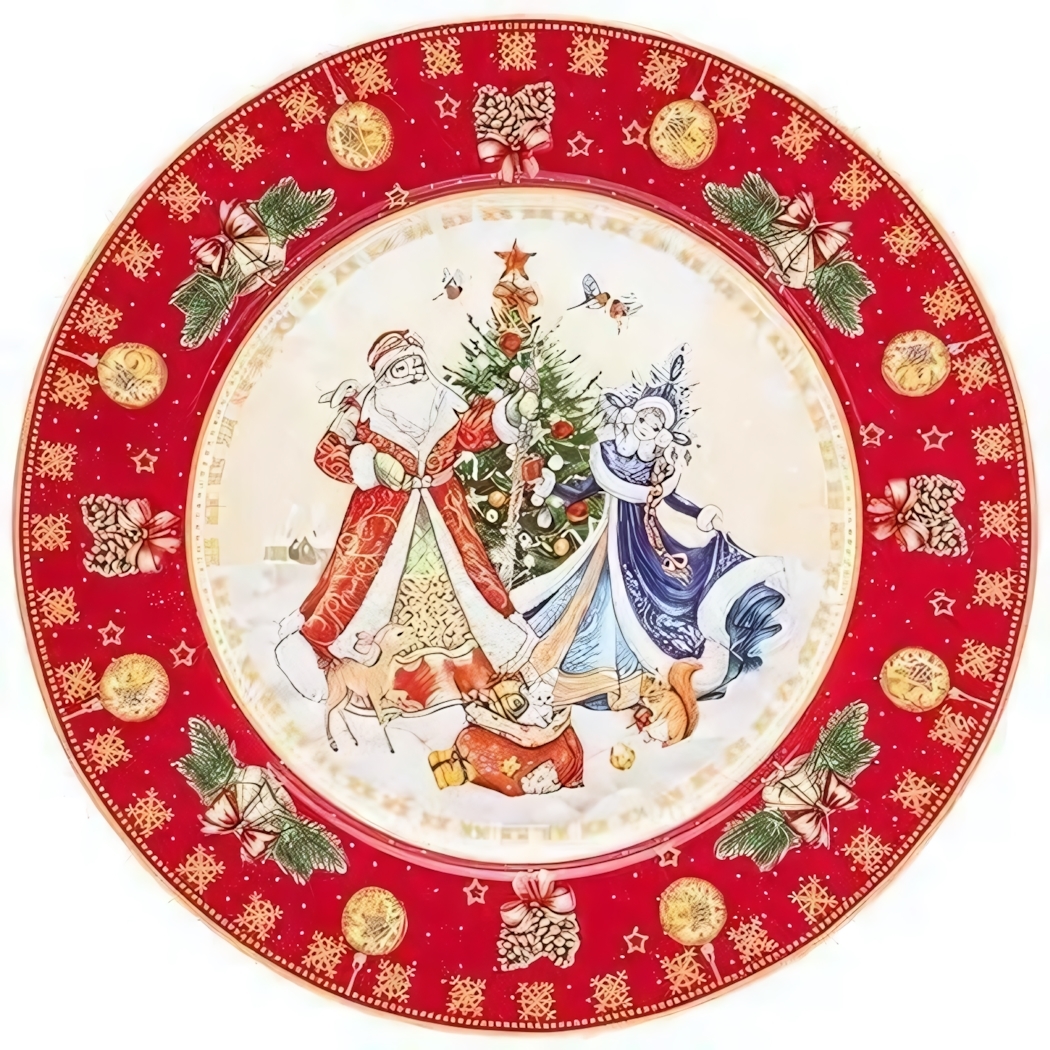 Погрузитесь в атмосферу зимней сказки с обеденной тарелкой диаметром 27 см, выполненной из прочного фарфора. Её яркий красный край украшен сложным золотистым орнаментом с еловыми ветками, шишками и бантами, а в центре — трогательная сцена с Дедом Морозом, Снегурочкой, ёлкой и милыми лесными животными.