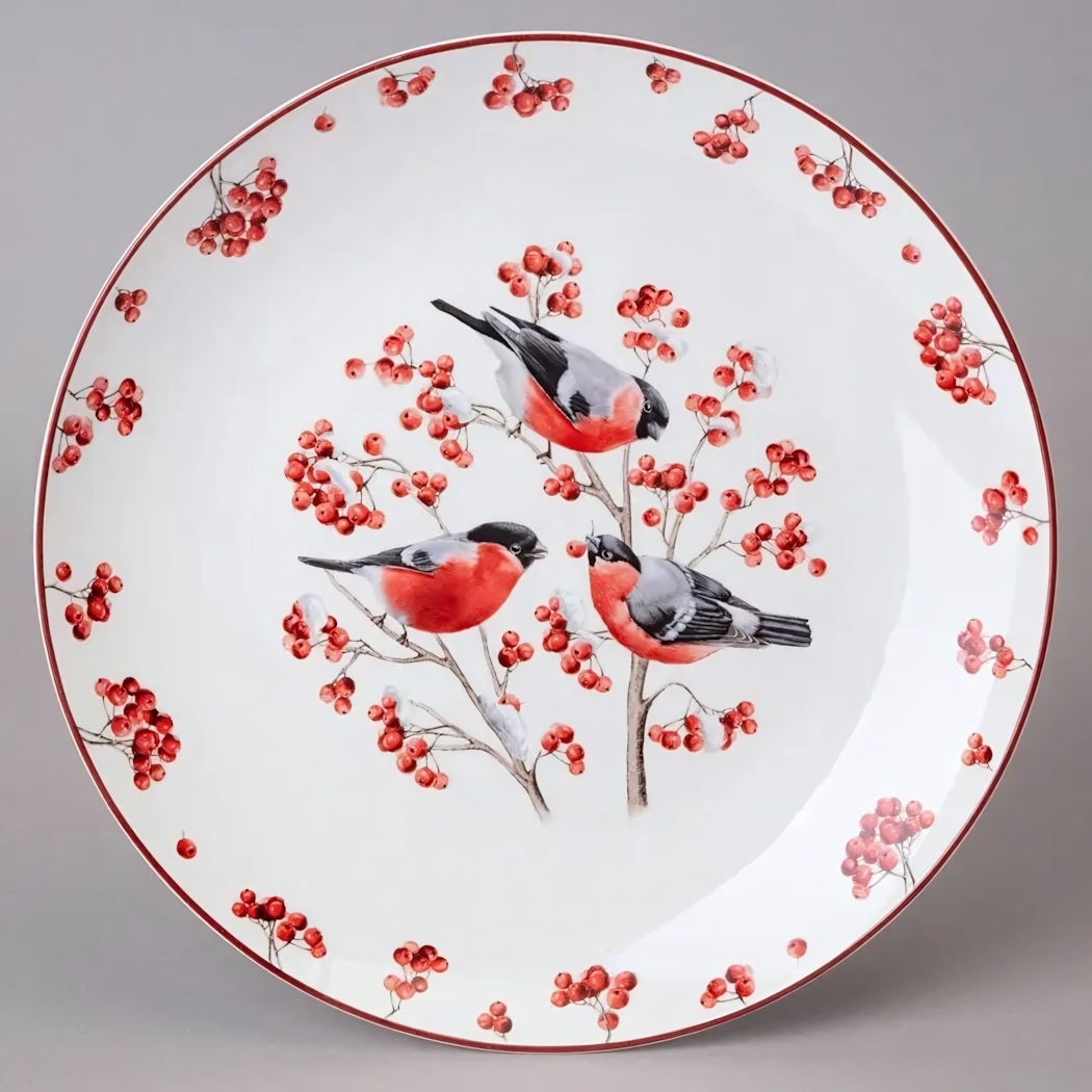 Эта элегантная фарфоровая тарелка с изысканным зимним орнаментом создаст атмосферу уюта за любым столом. Белый фон гармонично оттеняется рисунком трёх птиц с яркими красными брюшками и серо-чёрными крыльями, сидящих на ветках с гроздьями румяных ягод. По краю расположена тонкая красная линия и орнамент, подчёркивающий праздничное настроение.