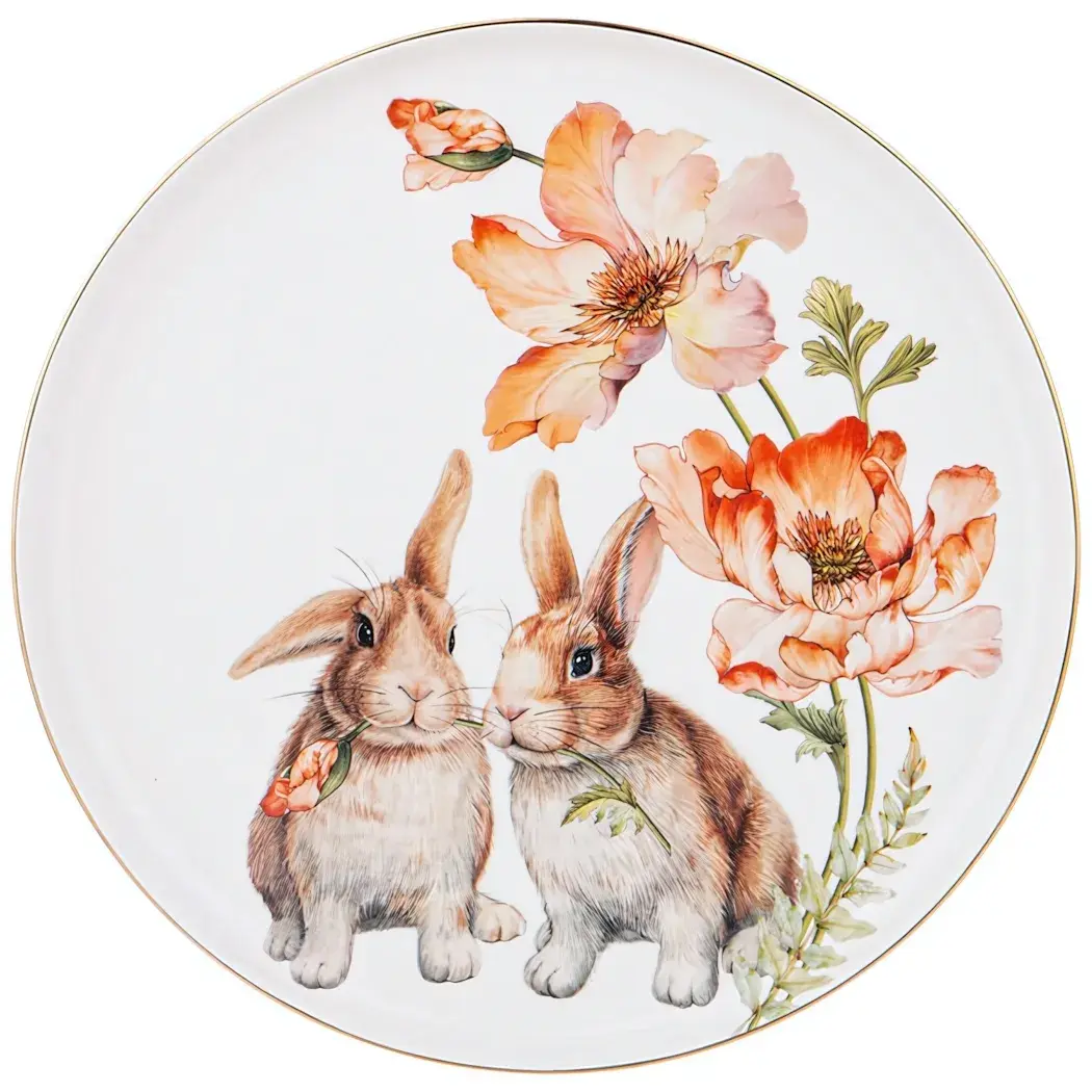 Тарелка идеально подходит для сервировки обедов и ужинов, а также может использоваться как декоративный элемент. Благодаря своему изысканному дизайну с изображением милых кроликов и нежных цветов, она станет отличным дополнением к любому праздничному столу или повседневной трапезе. Подходит для использования в домашних условиях, а также для подарков друзьям и близким.