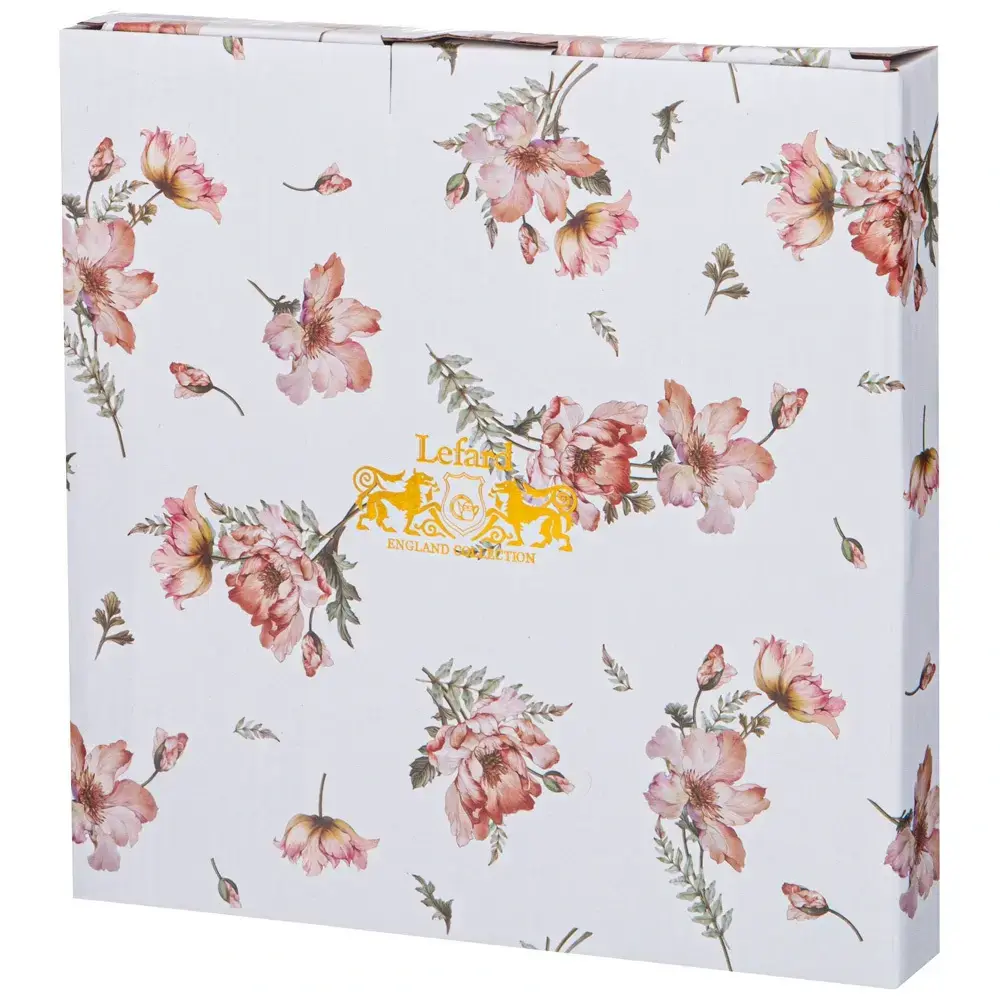 Размер тарелки составляет 23 см в диаметре, что делает её идеальной для подачи различных блюд. Белый фон с золотистой окантовкой придаёт ей элегантный вид, а цветочные мотивы добавляют яркости и свежести. Упакована в красивую коробку, что делает её отличным вариантом для подарка.