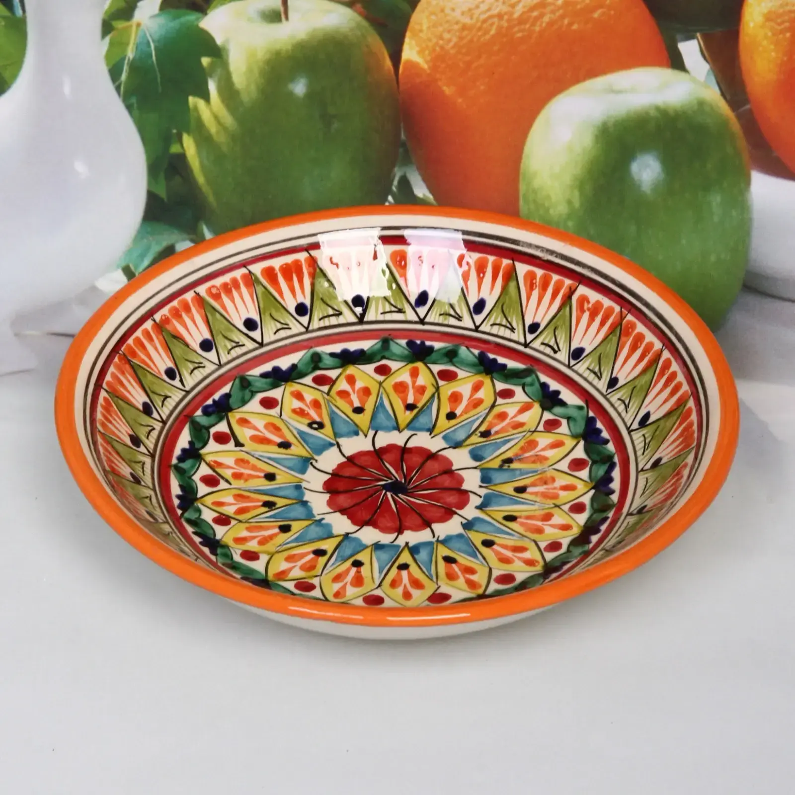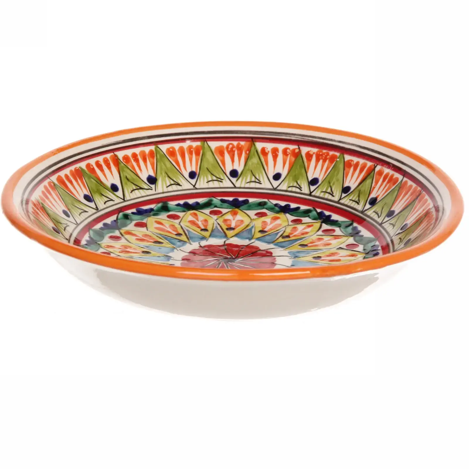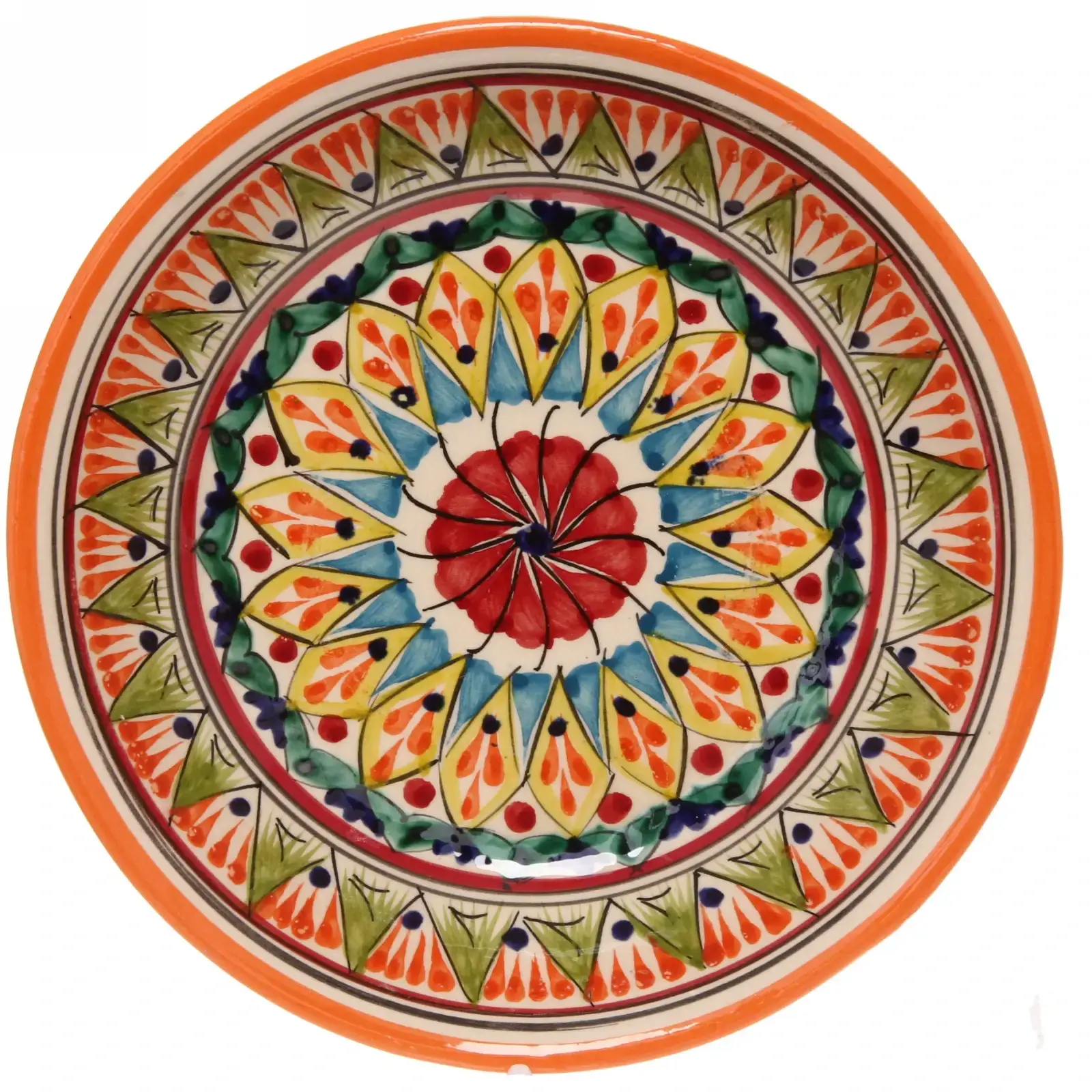 Эта плоская тарелка диаметром 19 см станет настоящим украшением вашего стола. Яркий оранжевый цвет и богатый декоративный рисунок с цветочными и геометрическими узорами создают атмосферу уюта и радости во время трапезы. Изготовленная из качественной керамики, она не только привлекает внимание, но и обеспечивает долговечность и надежность в использовании.
