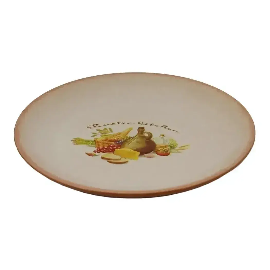 Тарелка украшена изображением натюрморта с сыром, овощами и хлебцами, что создаёт атмосферу деревенского уюта. Темный ободок с градиентом добавляет изделию элегантности.