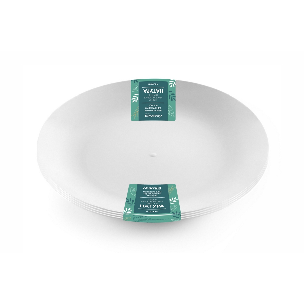 В наборе 4 плоские тарелки, каждая из которых имеет диаметр 200 мм. Они выполнены из прочного пластика, что делает их легкими и удобными в использовании. Белый цвет тарелок придаёт им стильный и современный вид, а также позволяет легко сочетать их с другими элементами сервировки. Выбирая набор «Натура», вы получаете не только практичное решение для сервировки, но и стильный аксессуар для вашего стола.