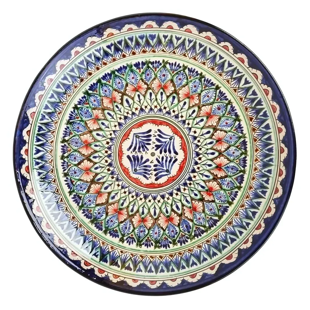 Плоская тарелка из риштанской керамики — это гармония традиционного ремесла и современной эстетики. Яркая синяя палитра и замысловатые орнаменты превратят обычную сервировку в произведение искусства, а прочность материала гарантирует долгие годы использования.