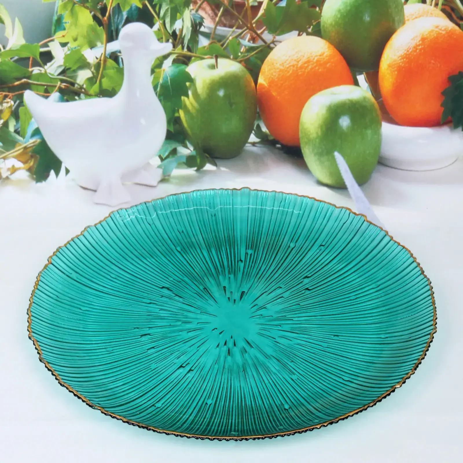 Тарелка стеклянная 32см «Флоренция» в изумрудном цвете — это идеальное сочетание стиля и функциональности. Она станет не только практичным элементом вашей кухонной посуды, но и ярким акцентом на любом столе. Благодаря рифленой текстуре и золотой окантовке, эта тарелка добавит изысканности в каждую сервировку.