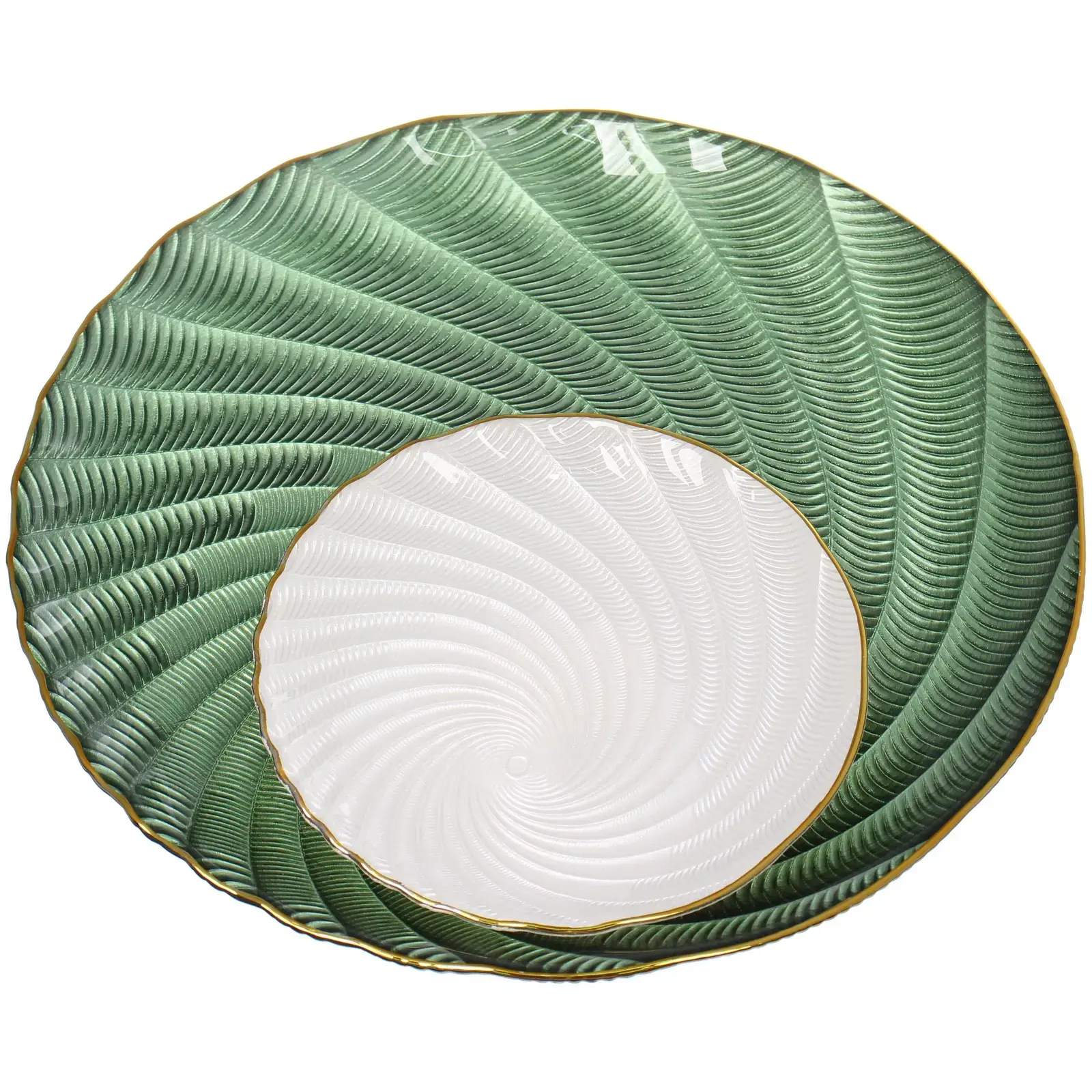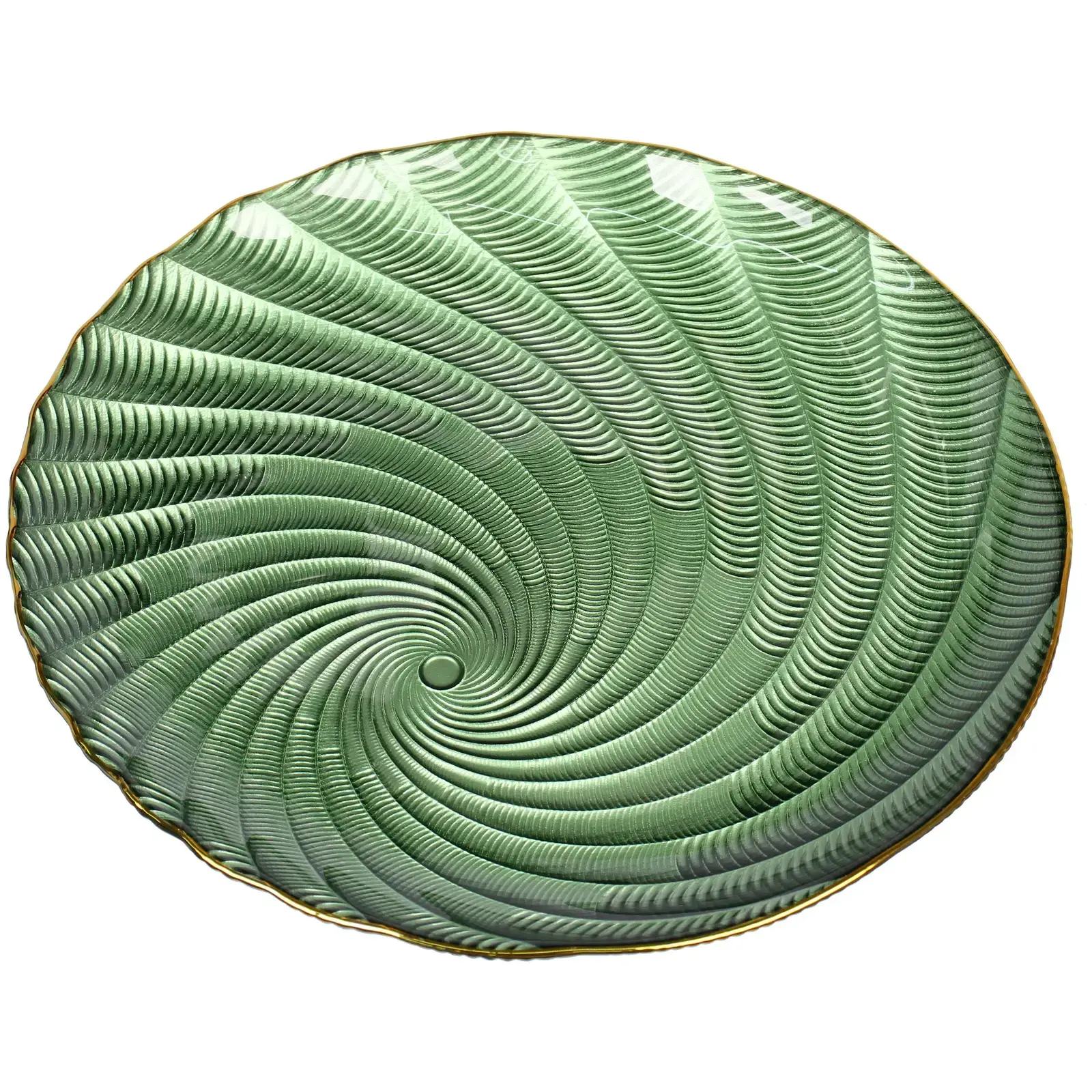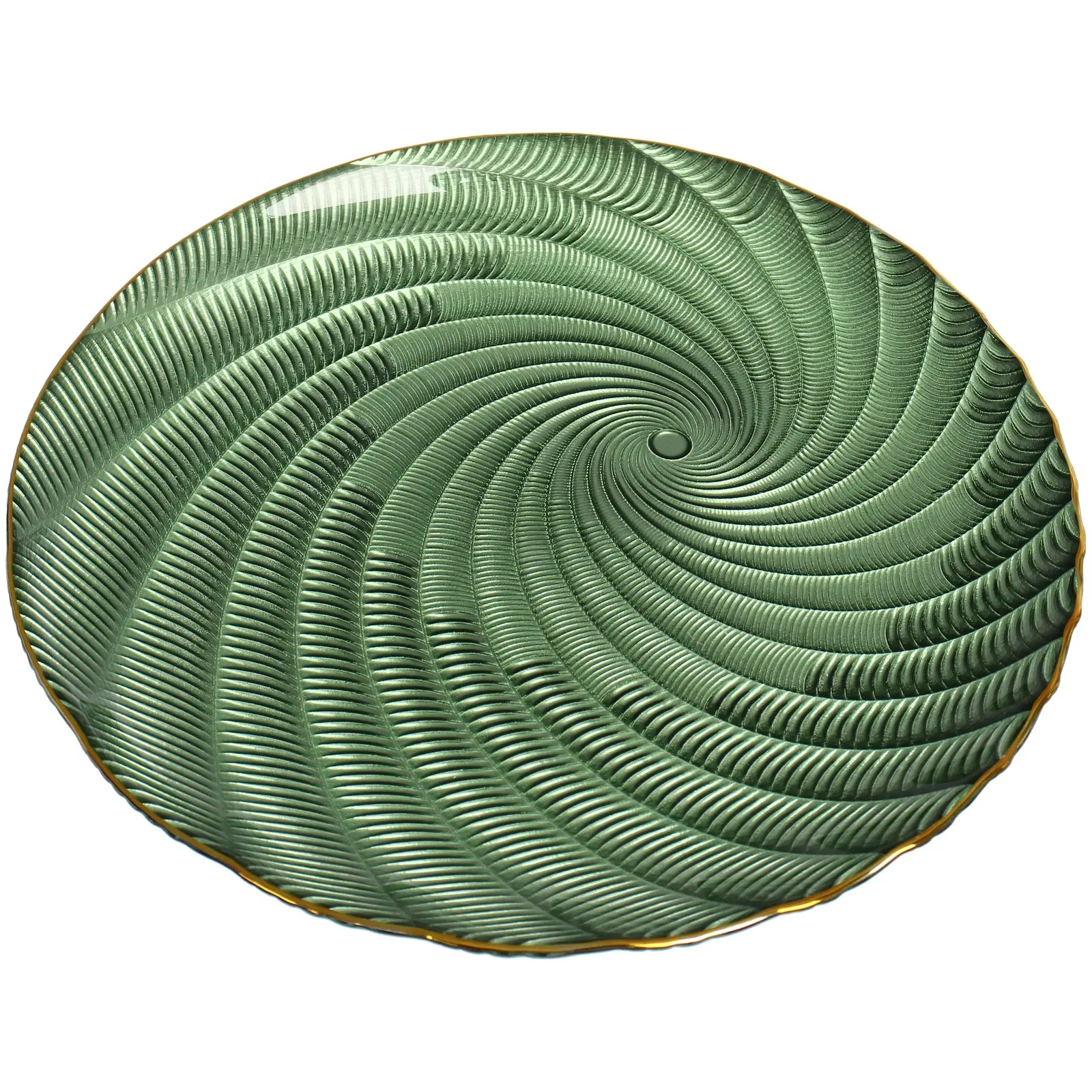 Стеклянная тарелка серии «Фьюжн» сочетает функциональность кухонной посуды с художественным дизайном. Перламутровые переливы изумрудного оттенка создают эффект драгоценного камня, а золотая окантовка добавляет ноту роскоши в повседневную сервировку.