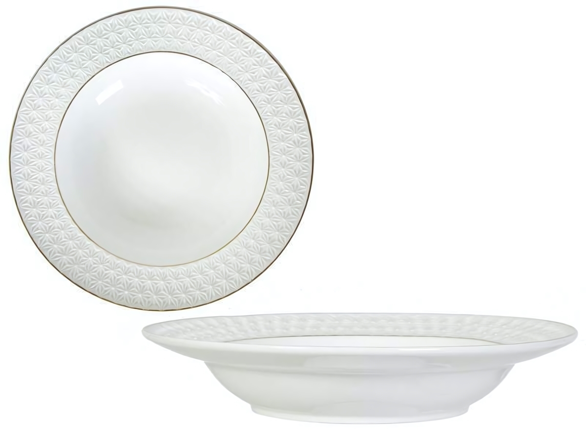 Суповая тарелка из высококачественного фарфора сочетает практичность и изысканный дизайн. Золотая окантовка и рельефный узор превратят сервировку в произведение искусства, а белоснежная поверхность подчеркнёт аппетитность блюд.