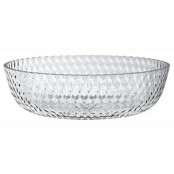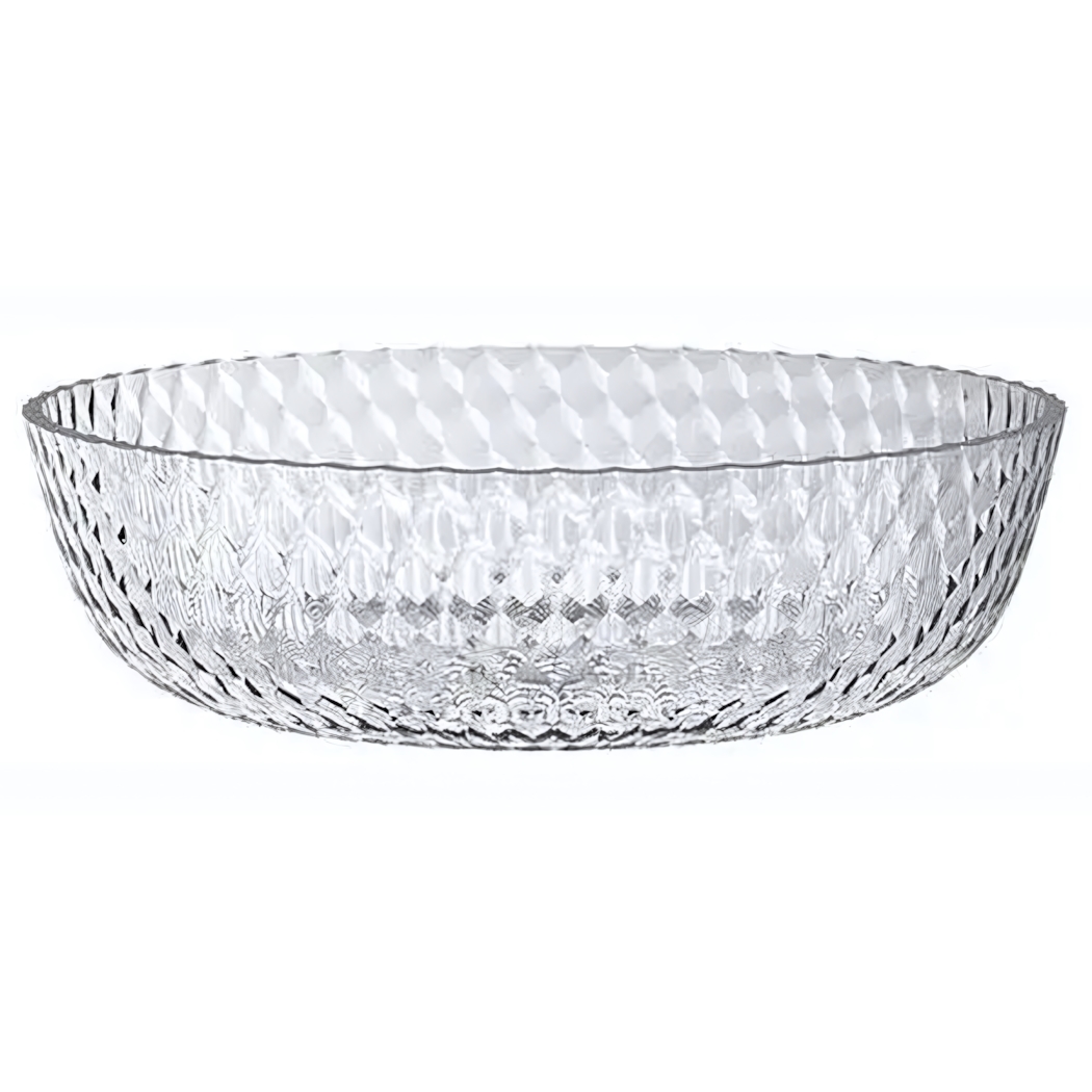 Диаметр 18 см оптимален для порционных блюд. Овальная форма с рельефной текстурой обеспечивает удобный захват. Вес 420 г создаёт приятное ощущение солидности без излишней тяжести. Полная прозрачность материала позволяет контролировать уровень наполнения.