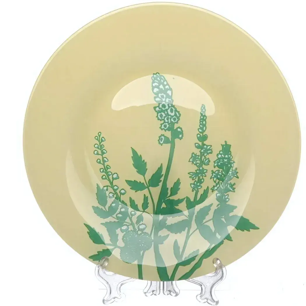 Диаметр 26 см оптимален для порционных блюд. Три варианта расцветки с растительными мотивами позволяют создавать стильные комбинации. Классический круговой узор с тонкой проработкой деталей сохраняет чёткость рисунка даже после многократного мытья.