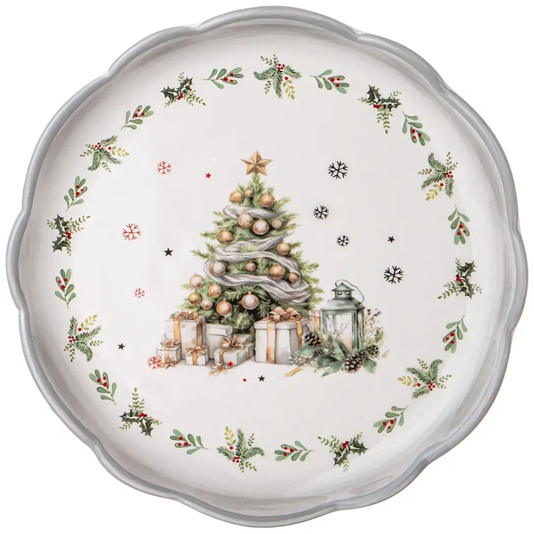 Эта закусочная тарелка станет настоящим украшением вашего праздничного стола. Оригинальный дизайн с изображением новогодней елки, подарков и снежинок создаст уютную атмосферу и порадует ваших гостей. Изготовленная из доломитовой керамики, она не только красива, но и практична в использовании.
