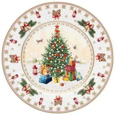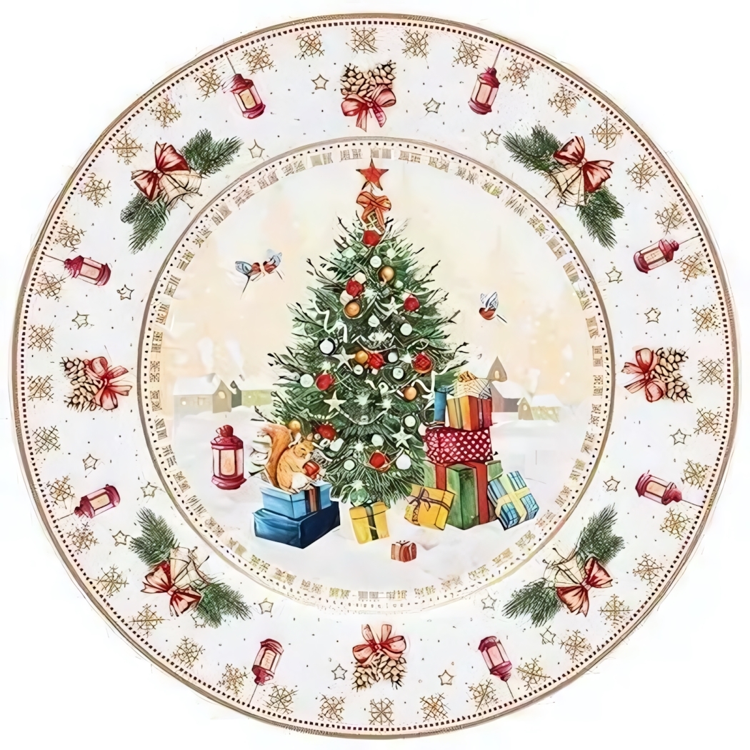 Белый фон изделия подчеркивает яркие зеленые, красные и золотистые элементы. Узоры с елочными ветками, украшениями и подарками создают завершенный образ праздничного стола. Легко сочетается с однотонной или тематической новогодней сервировкой. Благодаря прочному материалу тарелка сохраняет свой внешний вид даже при регулярном использовании.
