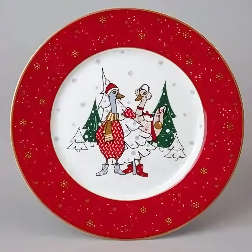 Круглая форма с широким красным бортиком, украшенным золотистой окантовкой и снежинками, дополнена белым центром, на котором изображены две утки в новогодних костюмах, окружённые зелёными ёлками и снежным фоном. Такая тарелка добавит радости в любую сервировку.