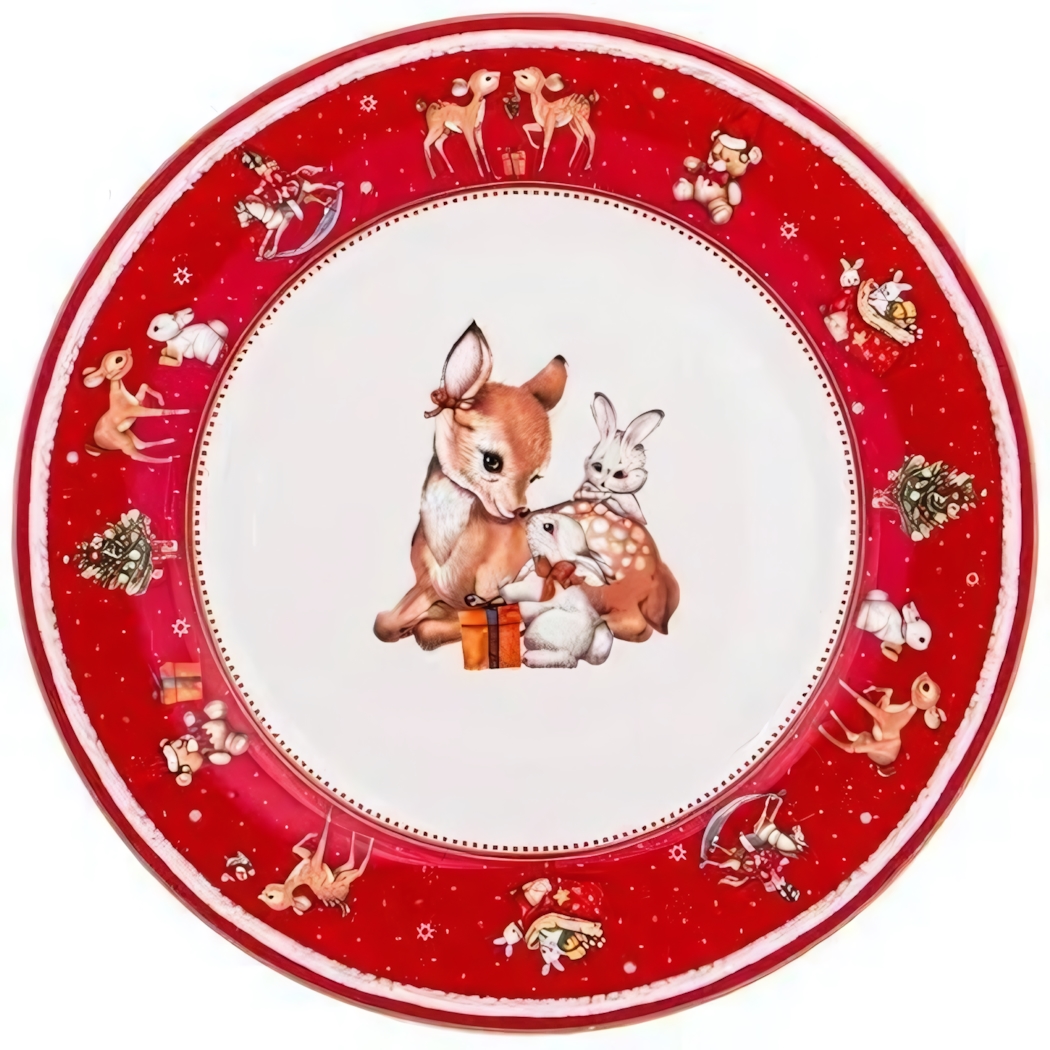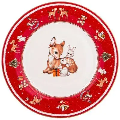 Добавьте уют и атмосферу зимнего праздника в сервировку вашего стола с этой закусочной тарелкой диаметром 19 см. Её красный ободок с белыми точками напоминает снежный вечер, а центральное изображение милого оленёнка и кролика в окружении подарков создает настроение ожидания сказочного Нового года.