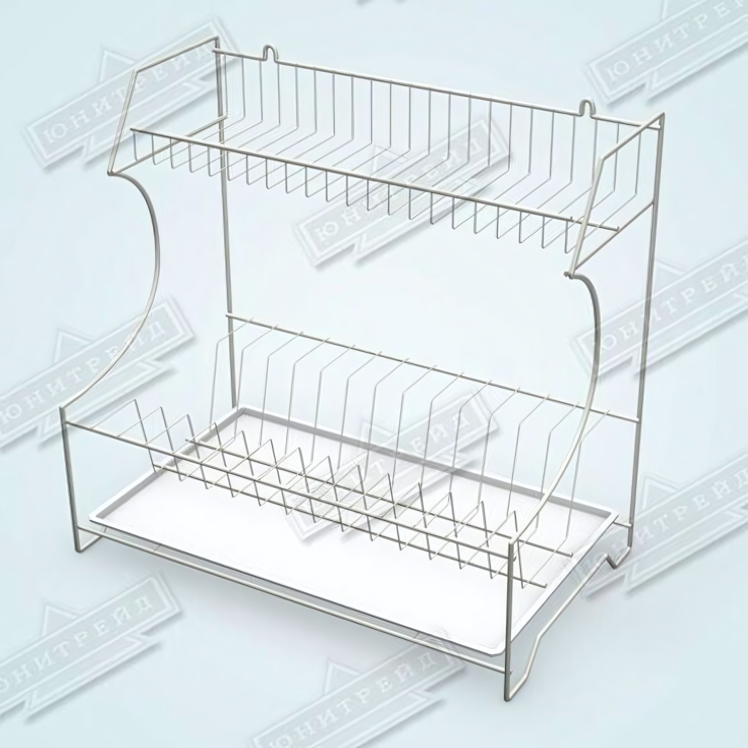 Конструкция из прочного материала обеспечивает долговечность, а наличие поддона предотвращает протечки и собирает лишнюю влагу, делая процесс сушки более гигиеничным. Подставка из металла с двумя уровнями позволяет размещать различный размер посуды, будь то тарелки, миски или крышки. Все детали легко снимаются для очищения, что обеспечивает гигиеничность.