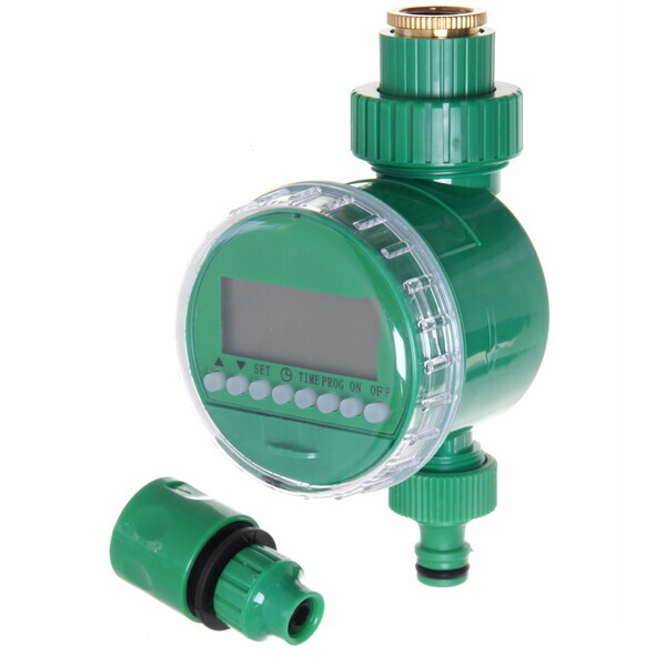 Таймер имеет компактные размеры, что позволяет удобно разместить его в любом месте вашего сада. Он выполнен в привлекательном зеленом цвете, что гармонично вписывается в природный ландшафт. Устройство также включает дополнительный элемент для подключения к шлангу или другой системе полива, что делает его универсальным решением для вашего сада.