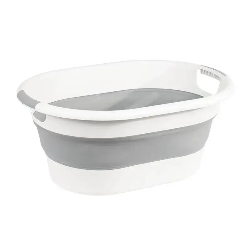 Практичное решение для дома с продуманной конструкцией: овальная форма и складной механизм экономят место при хранении, а прочные ручки обеспечивают удобную переноску.