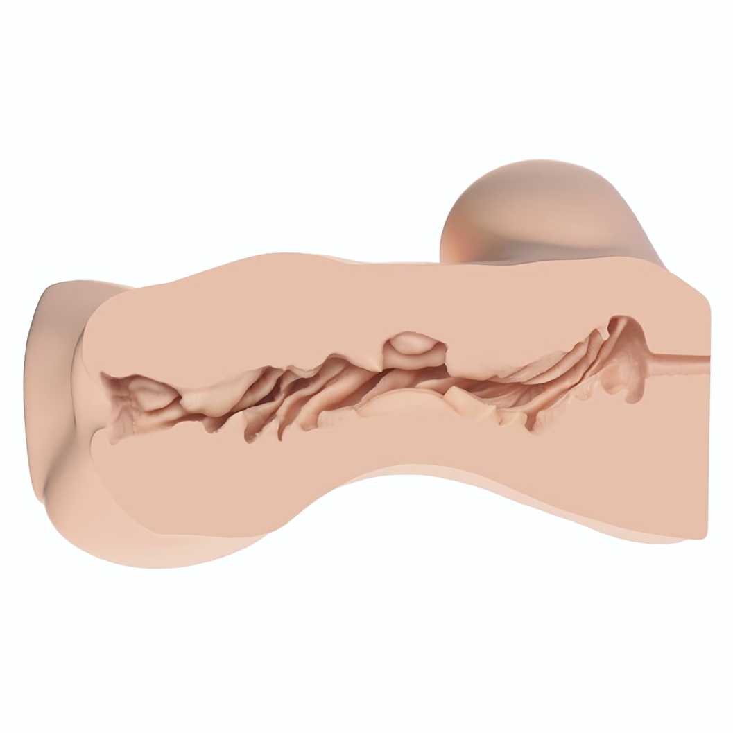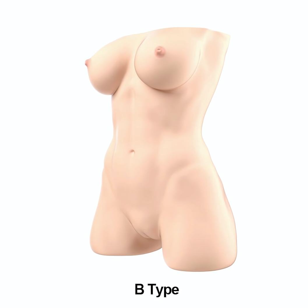 Модель выполнена в формате женского торса с аккуратной грудью типа B и выраженными изгибами. Внутренний канал имеет сложную текстуру со складками и сужениями, что обеспечивает разнообразную стимуляцию по всей длине. Изделие удобно использовать как в руках, так и фиксируя на поверхности — форма корпуса обеспечивает устойчивость и комфортный хват.