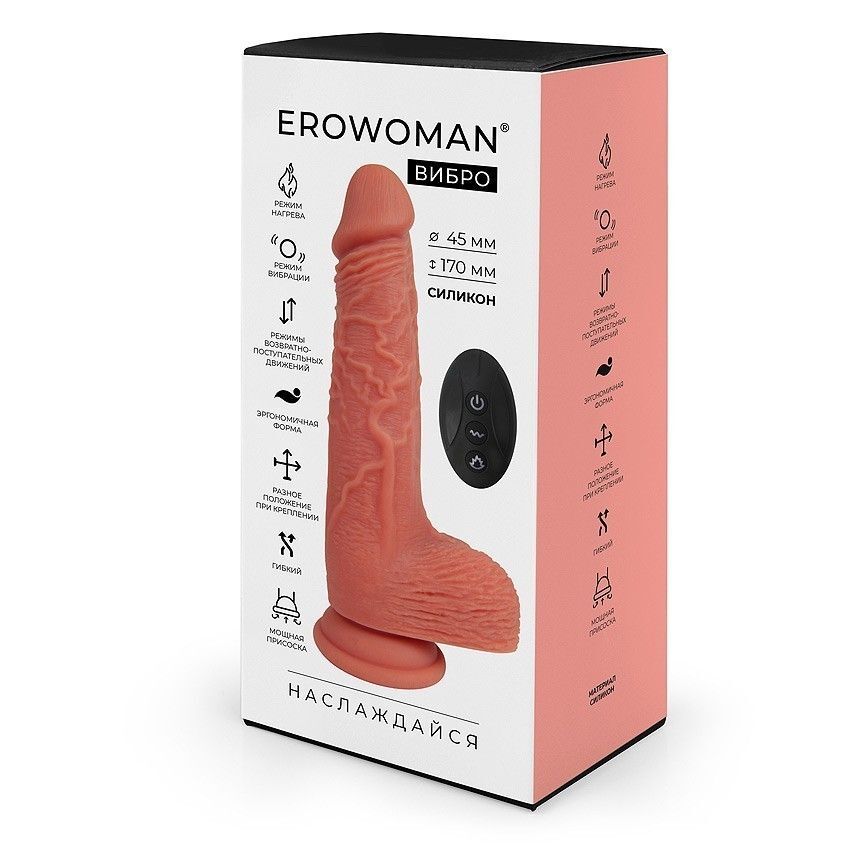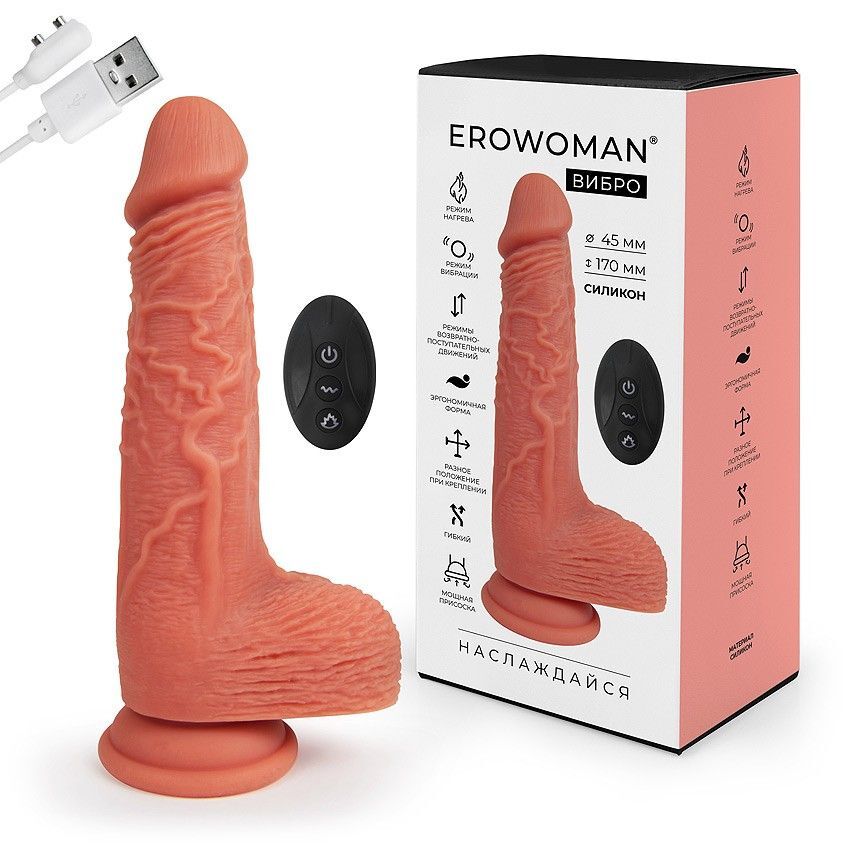 Вибратор-реалистик EROWOMAN ВИБРО с нагревом, 7 режимов вибрации, 22,5 см, силикон, телесный цвет