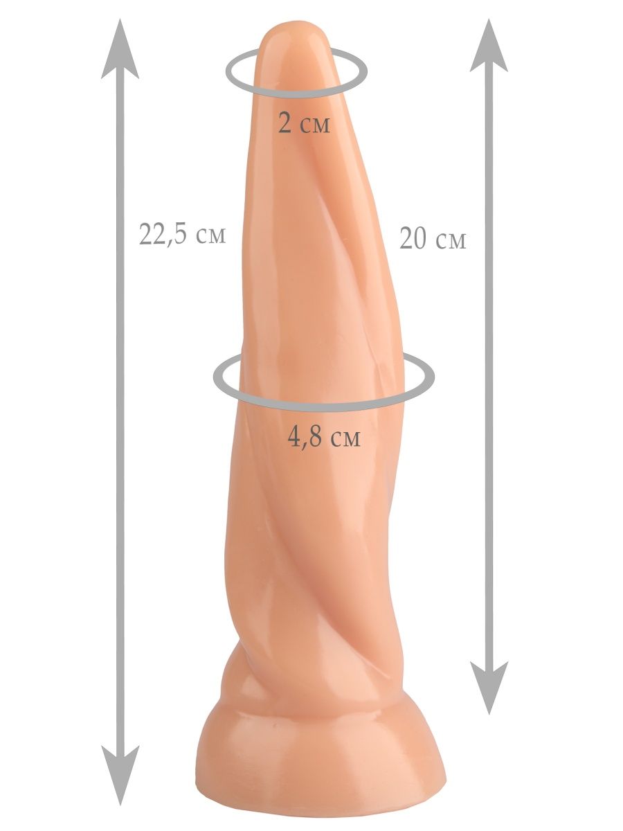 Общая длина изделия составляет 22.5 см, при этом рабочая (вводимая) часть — 20 см. Такая длина позволяет достичь глубокой и эффективной стимуляции. Телесный цвет добавляет реалистичности и эстетики.