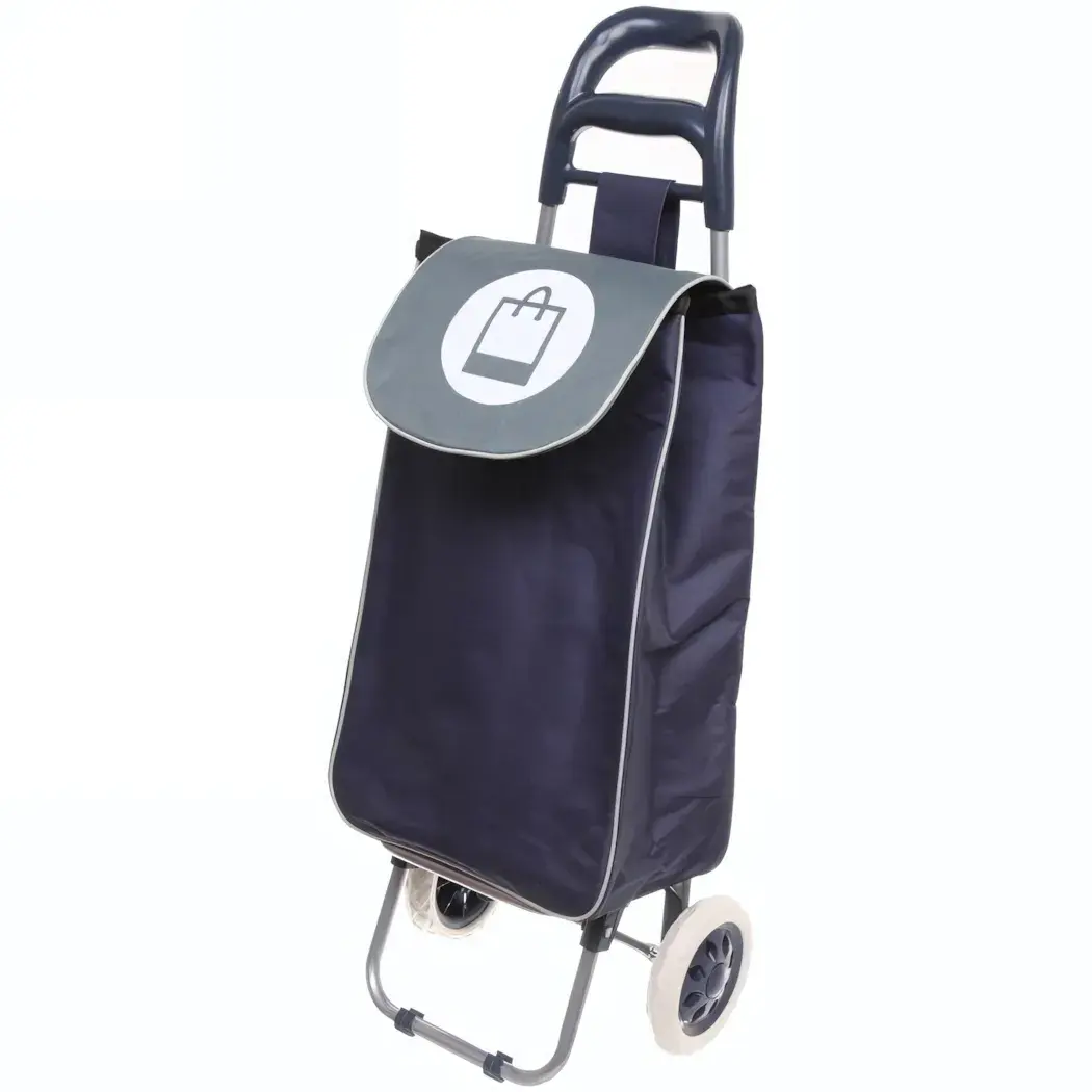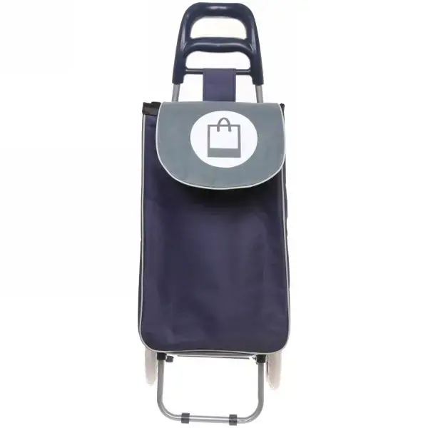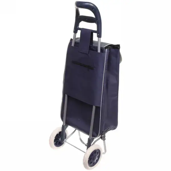 Тележка выполнена в стильном темно-синем цвете и имеет текстильный контейнер, который легко чистится. Колеса белого цвета обеспечивают хорошую проходимость и устойчивость на различных поверхностях. Сумка на колесах оснащена верхней крышкой с застёжкой на молнии и дополнительными карманами для мелочей, что делает её ещё более функциональной.