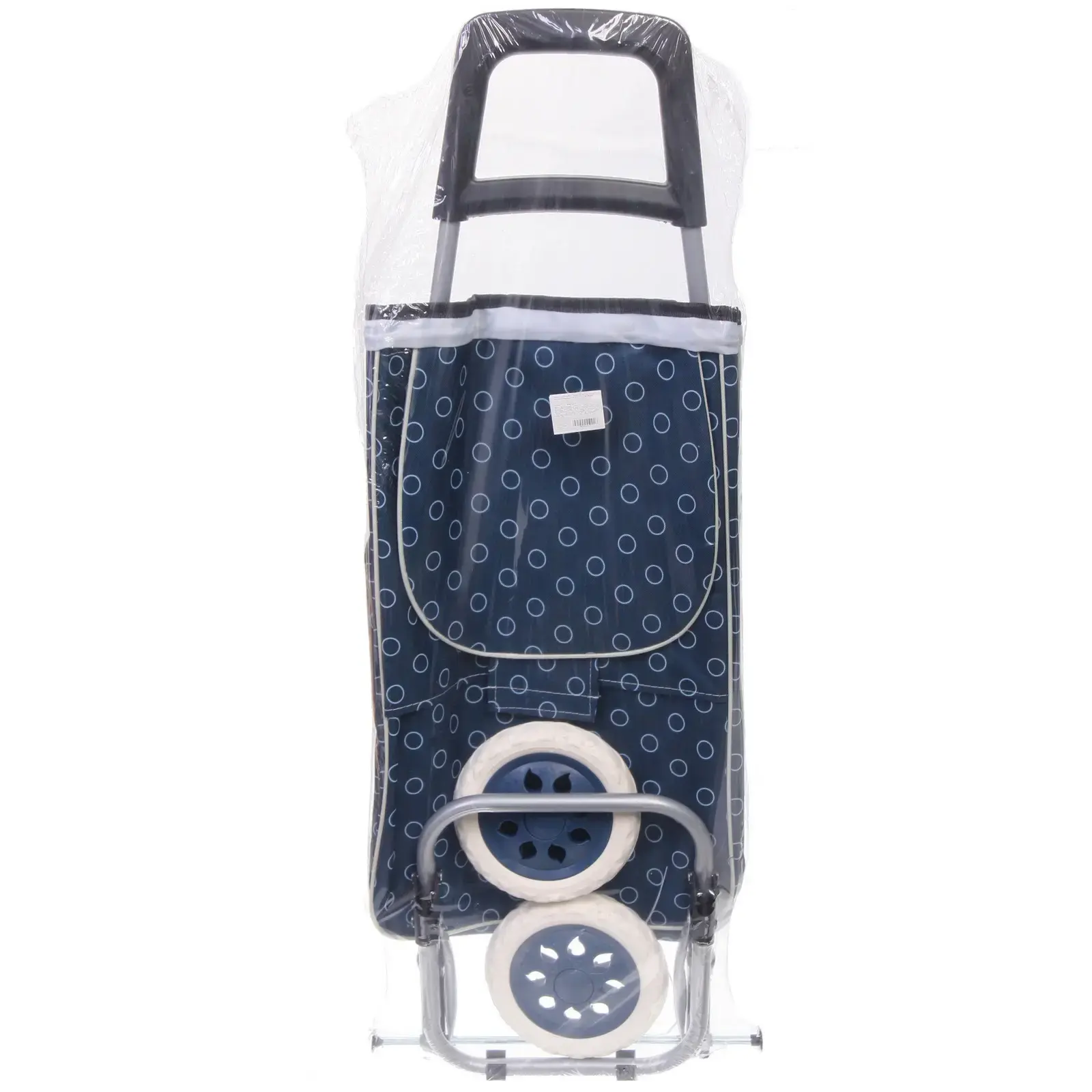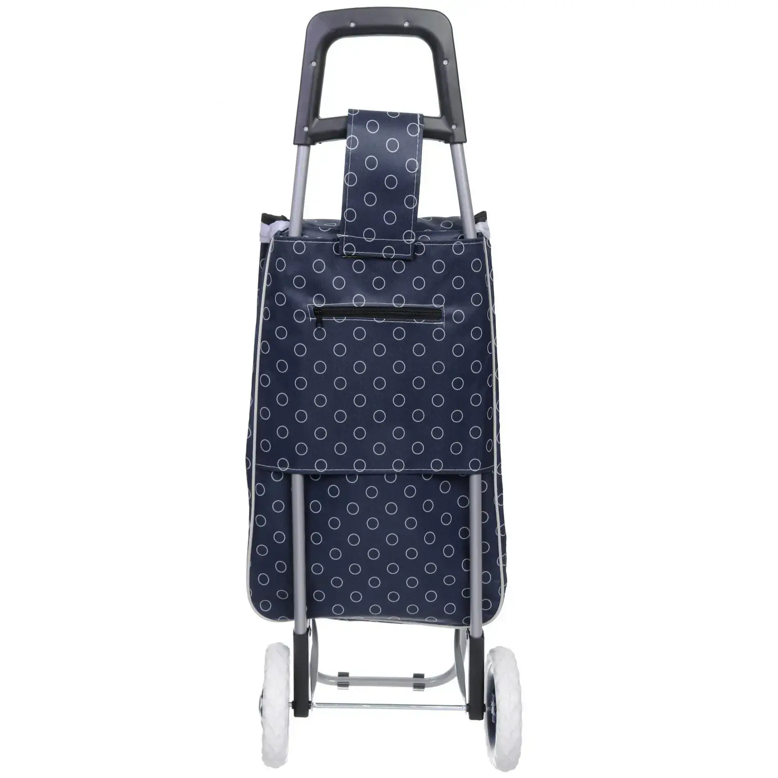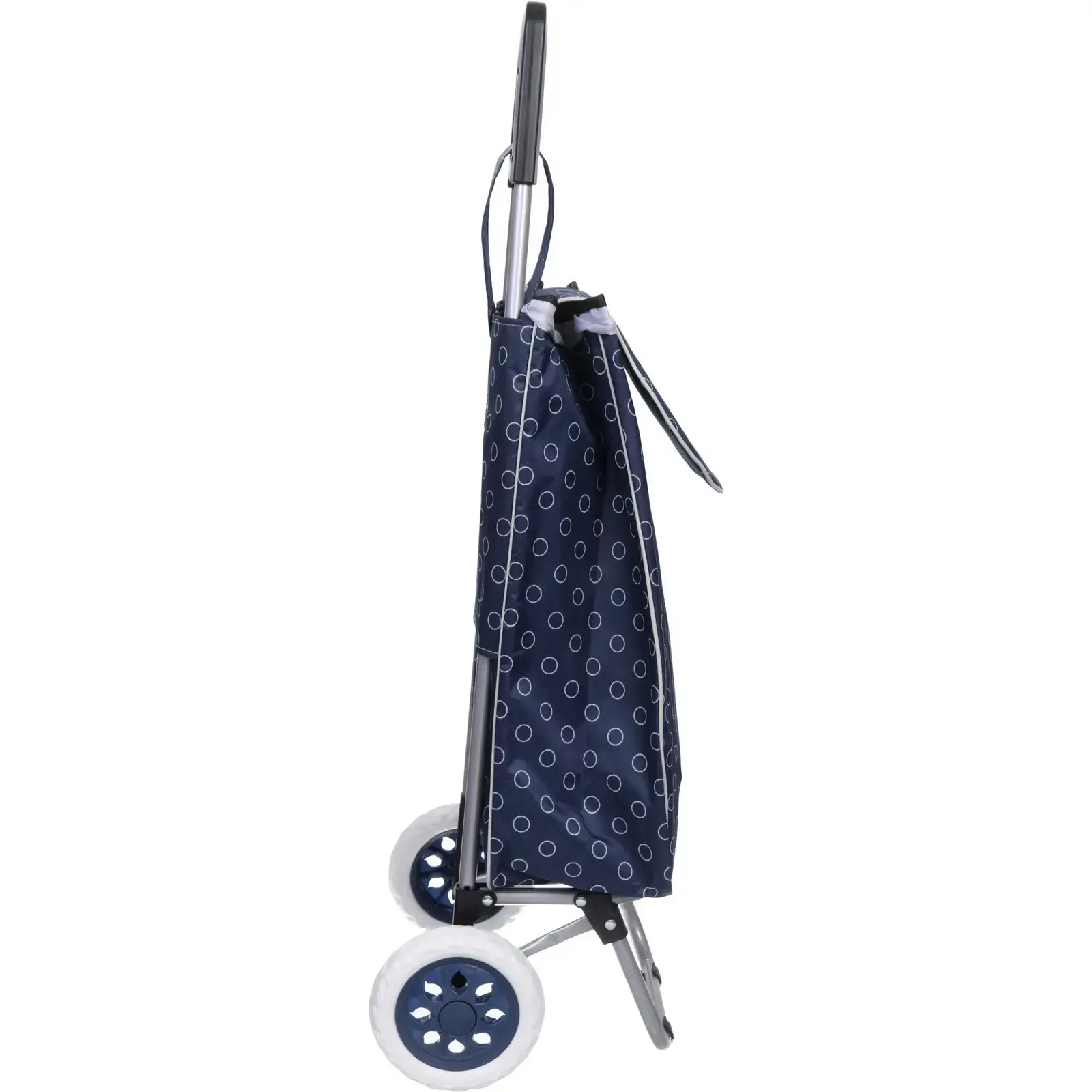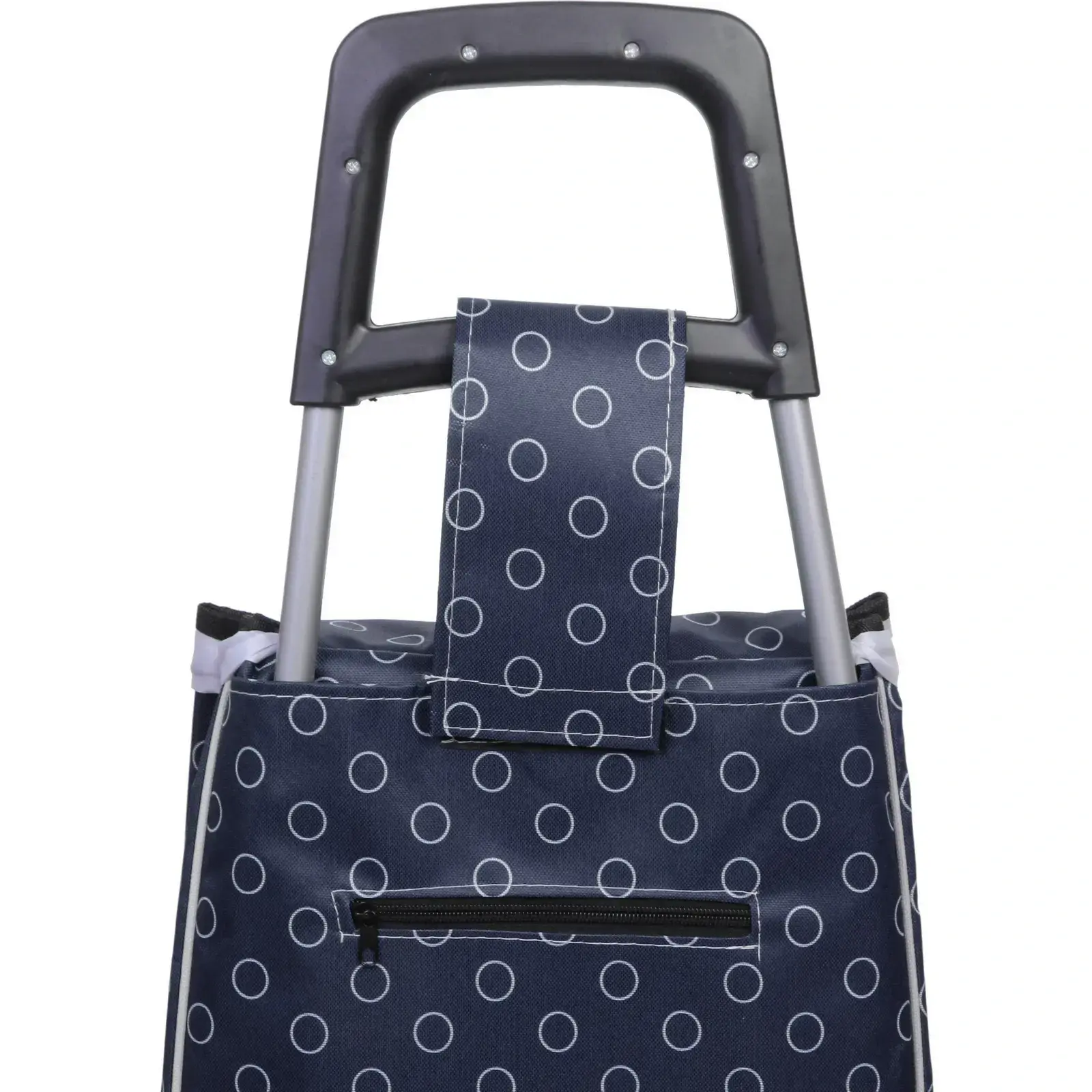 Сумка выполнена из прочного текстильного материала, который защищает содержимое от влаги, а также имеет объемный задний карман на молнии для хранения мелочей. Конструкция тележки позволяет оставлять её в вертикальном положении без дополнительного внимания, что очень удобно в условиях городской суеты. Благодаря стильному дизайну в темно-синем цвете с белыми кругами, она станет не только практичным, но и стильным аксессуаром.