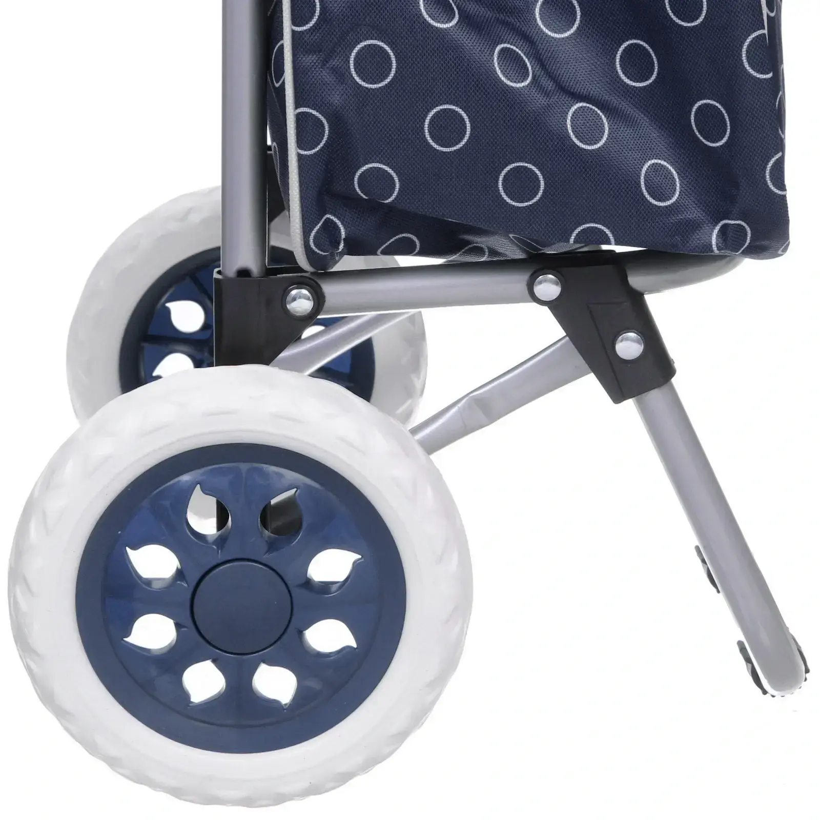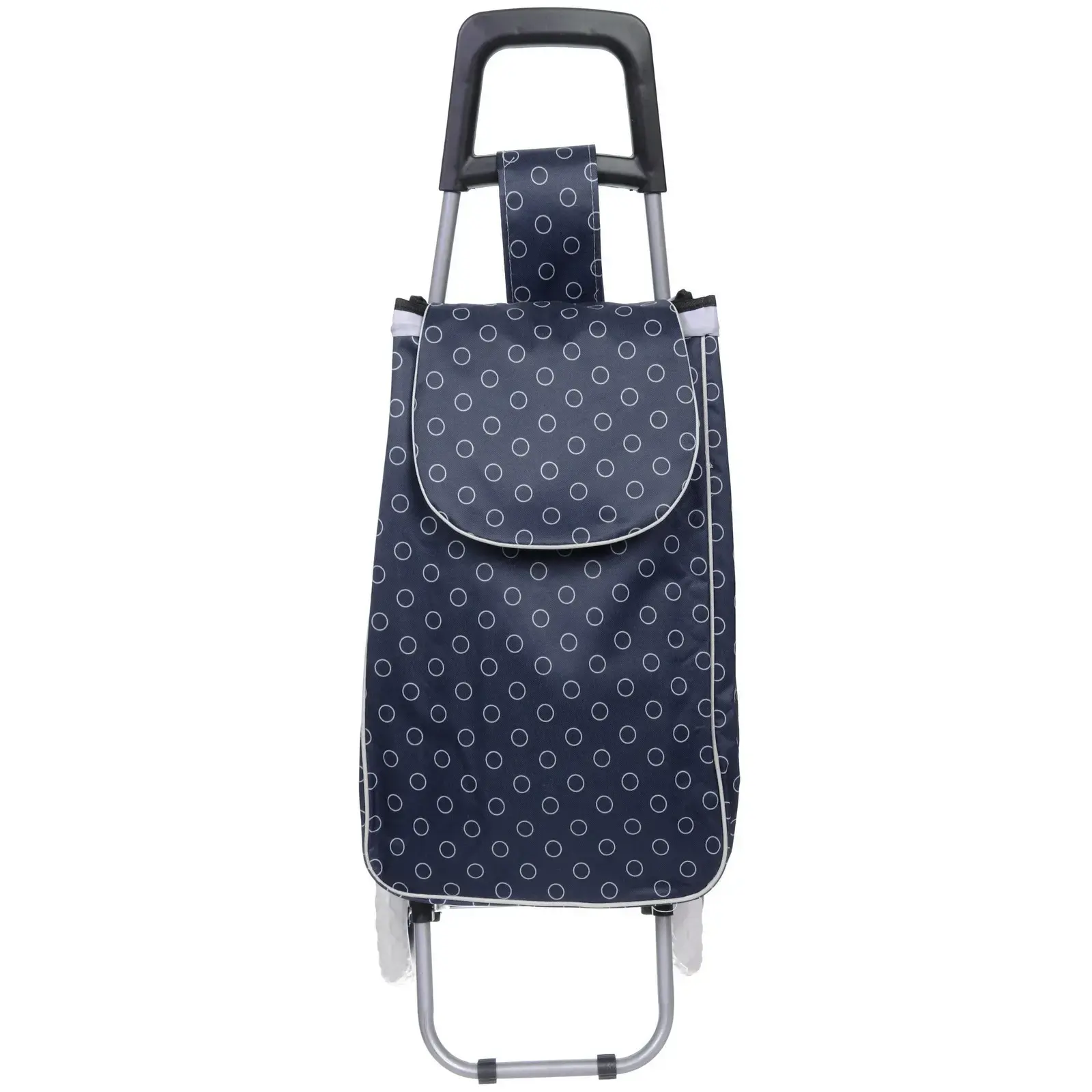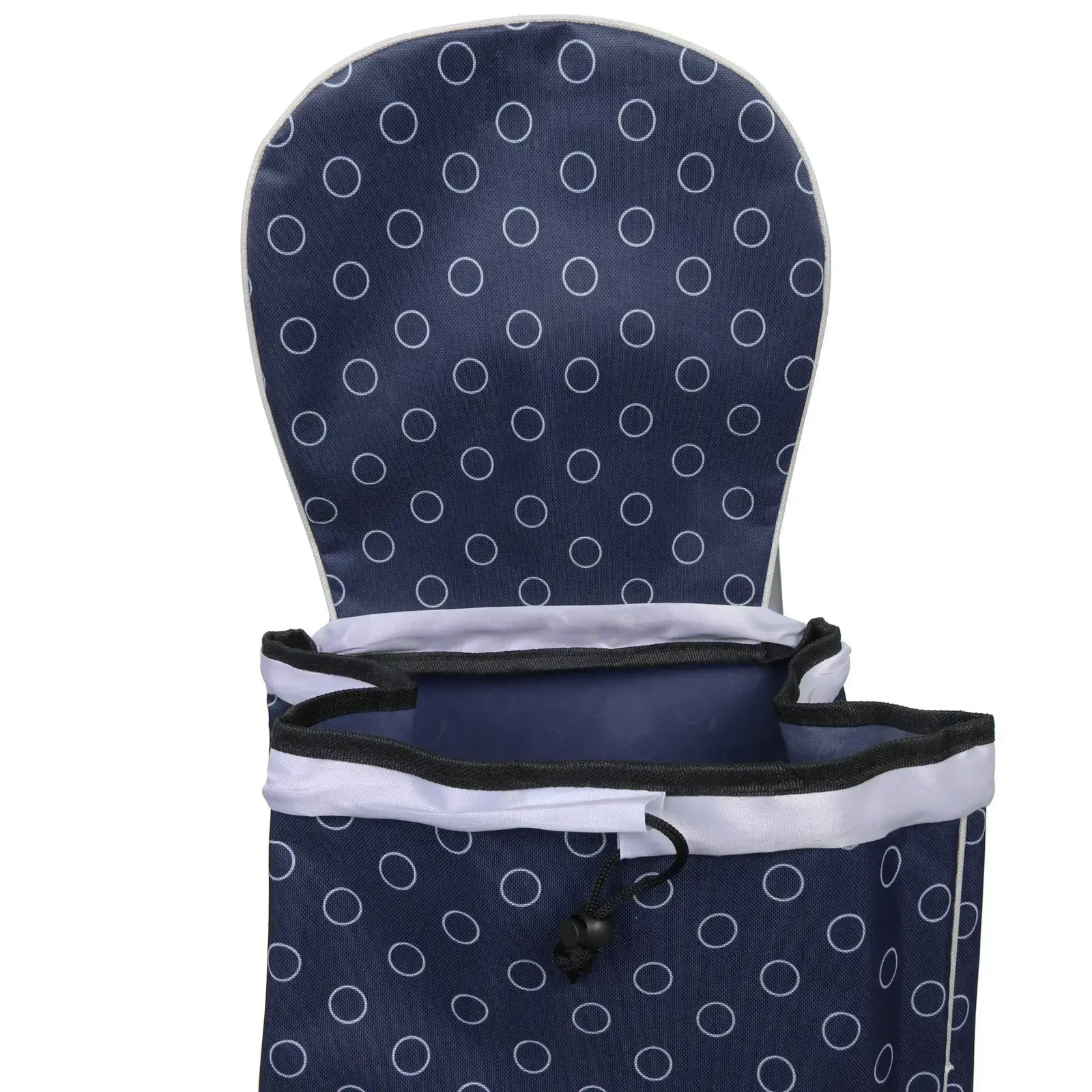 Сумка выполнена из прочного текстильного материала, который защищает содержимое от влаги, а также имеет объемный задний карман на молнии для хранения мелочей. Конструкция тележки позволяет оставлять её в вертикальном положении без дополнительного внимания, что очень удобно в условиях городской суеты. Благодаря стильному дизайну в темно-синем цвете с белыми кругами, она станет не только практичным, но и стильным аксессуаром.