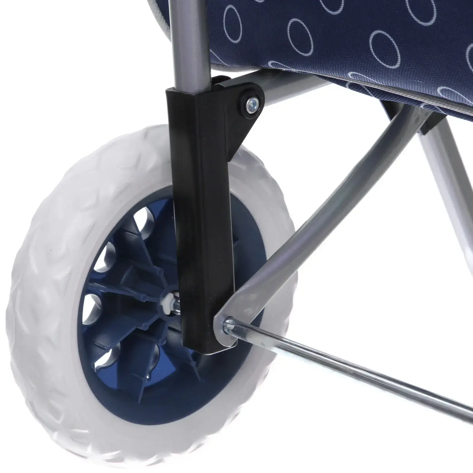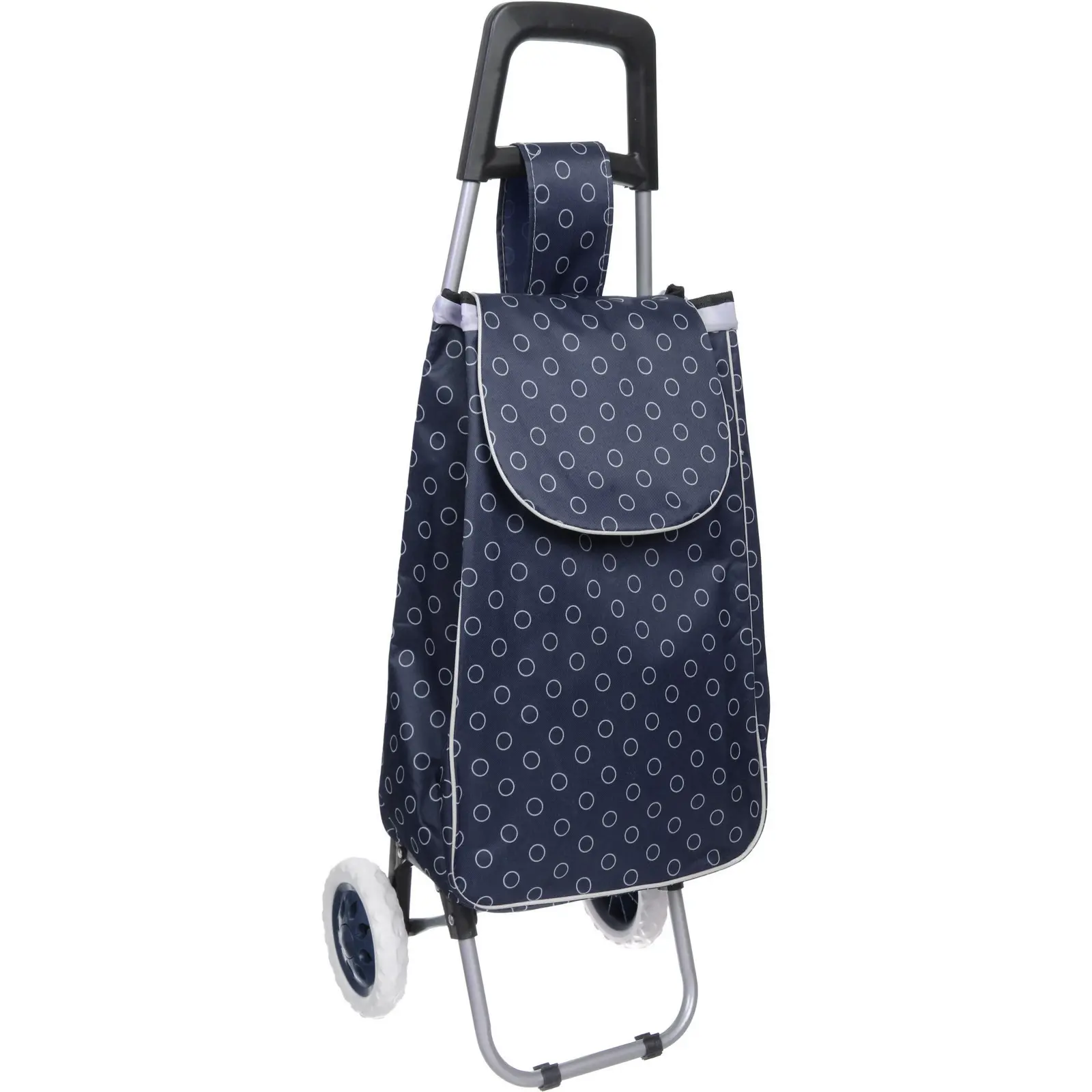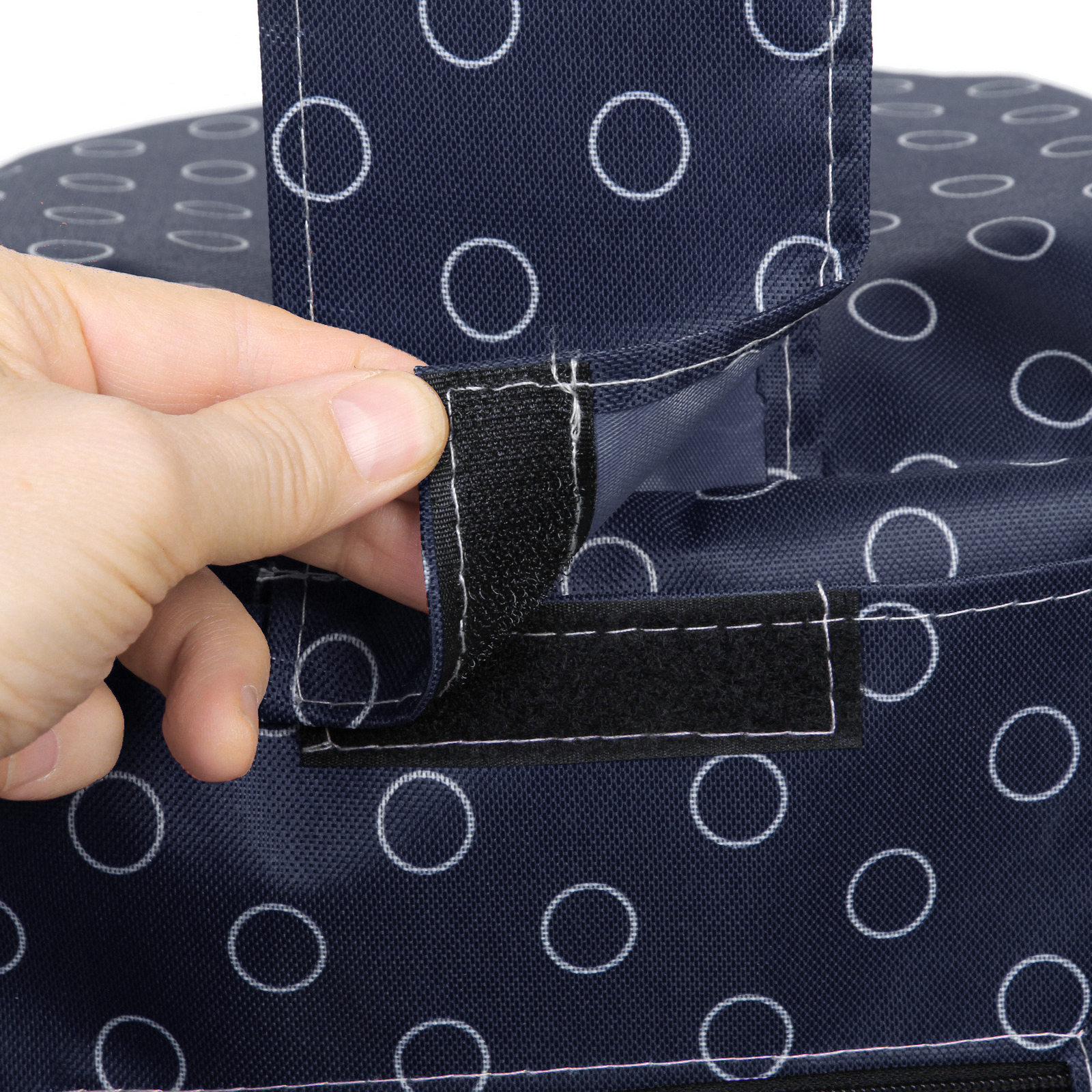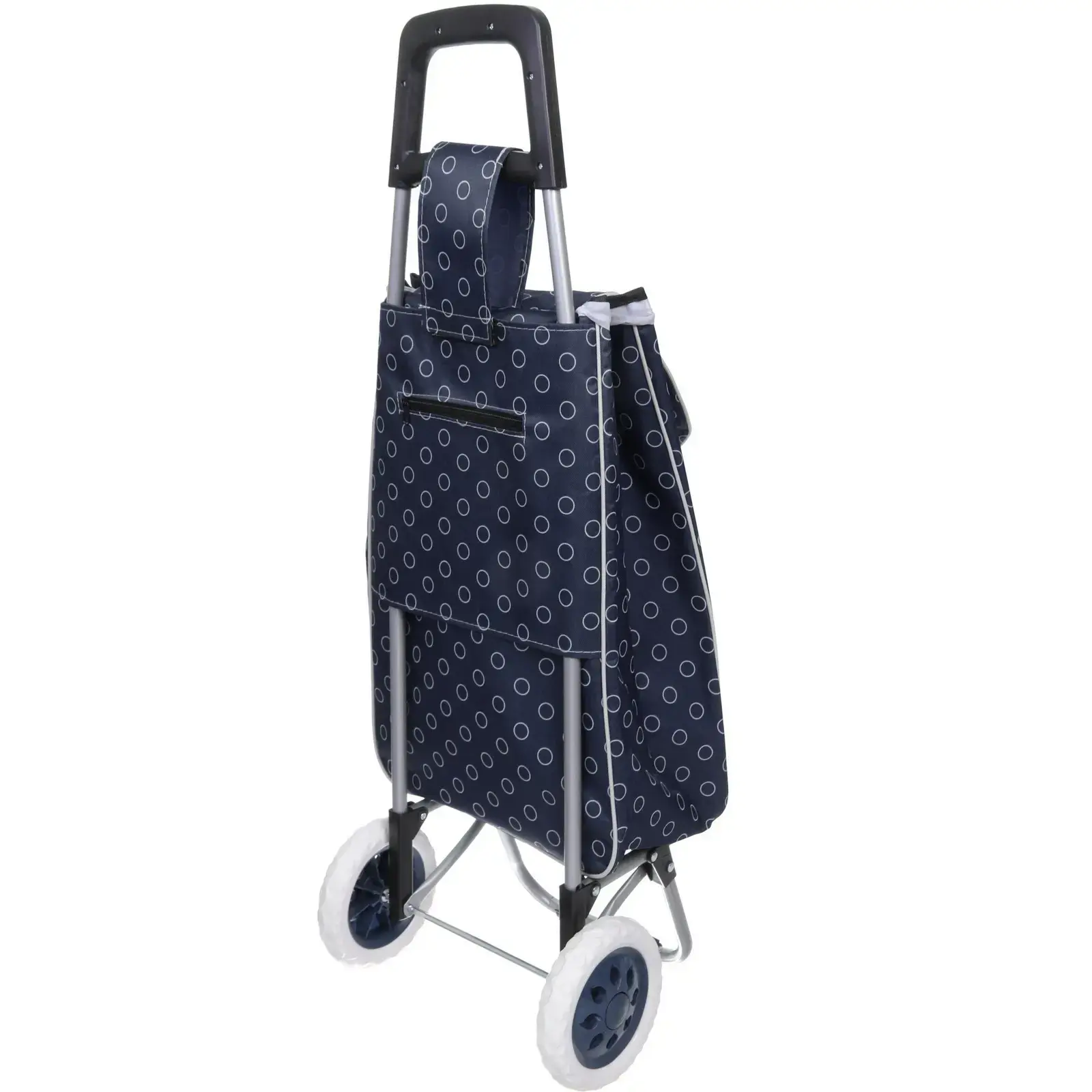 Сумка выполнена из прочного текстильного материала, который защищает содержимое от влаги, а также имеет объемный задний карман на молнии для хранения мелочей. Конструкция тележки позволяет оставлять её в вертикальном положении без дополнительного внимания, что очень удобно в условиях городской суеты. Благодаря стильному дизайну в темно-синем цвете с белыми кругами, она станет не только практичным, но и стильным аксессуаром.