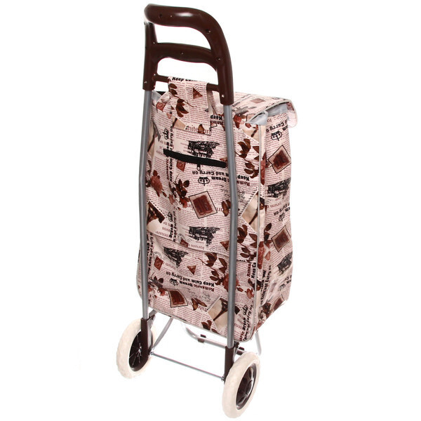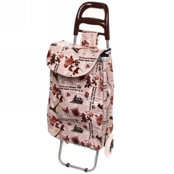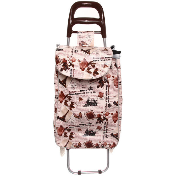 Выбирая эту тележку, вы получаете не только удобство, но и стильный дизайн. Сумка украшена принтом с цветами и элементами, напоминающими старинные газеты, что придаёт ей уникальный вид. Эргономичная ручка из коричневого пластика обеспечивает комфортный захват, а складной верх с застежкой-липучкой позволяет легко загружать и выгружать покупки.