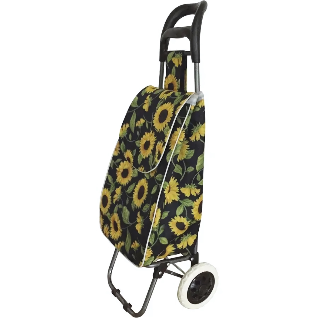 Тележка выполнена в черном цвете с ярким узором из подсолнухов, что добавляет ей стильности. Двойная ручка обеспечивает удобный захват при переноске. Идеально подходит для ежедневного использования.