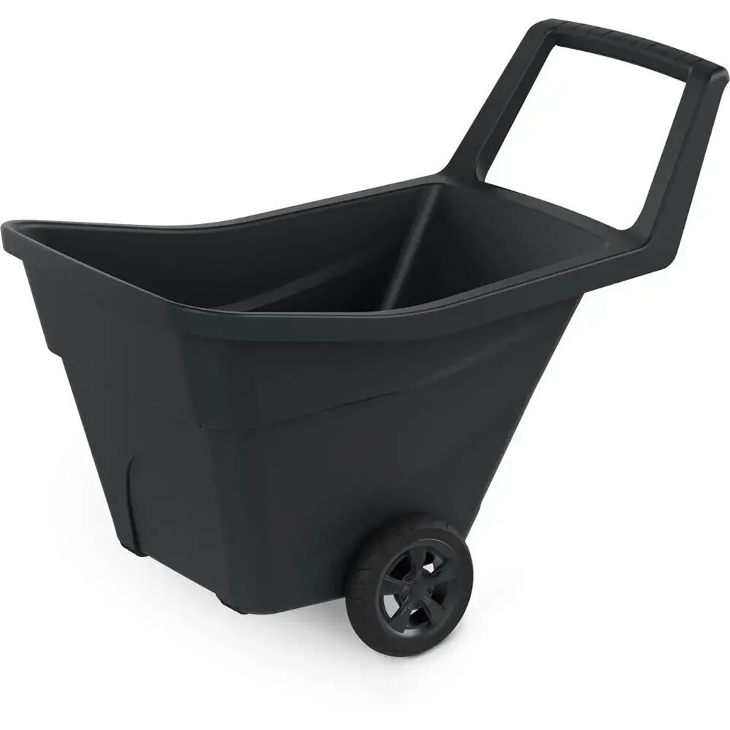 Тележка изготовлена из качественного пластика черного цвета, который не выгорает на солнце и сохраняет презентабельный вид долгое время. Её можно использовать для самых разных целей: от перевозки садового инвентаря до транспортировки строительных материалов.