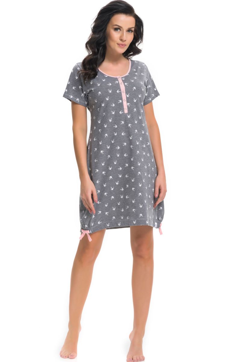 Эта темно-серая сорочка на пуговицах станет вашим любимым предметом домашнего гардероба. Модель с нежным принтом в виде ласточек создаёт лёгкое, романтичное настроение, а комфортный крой обеспечивает полную свободу движений для отдыха и сна.