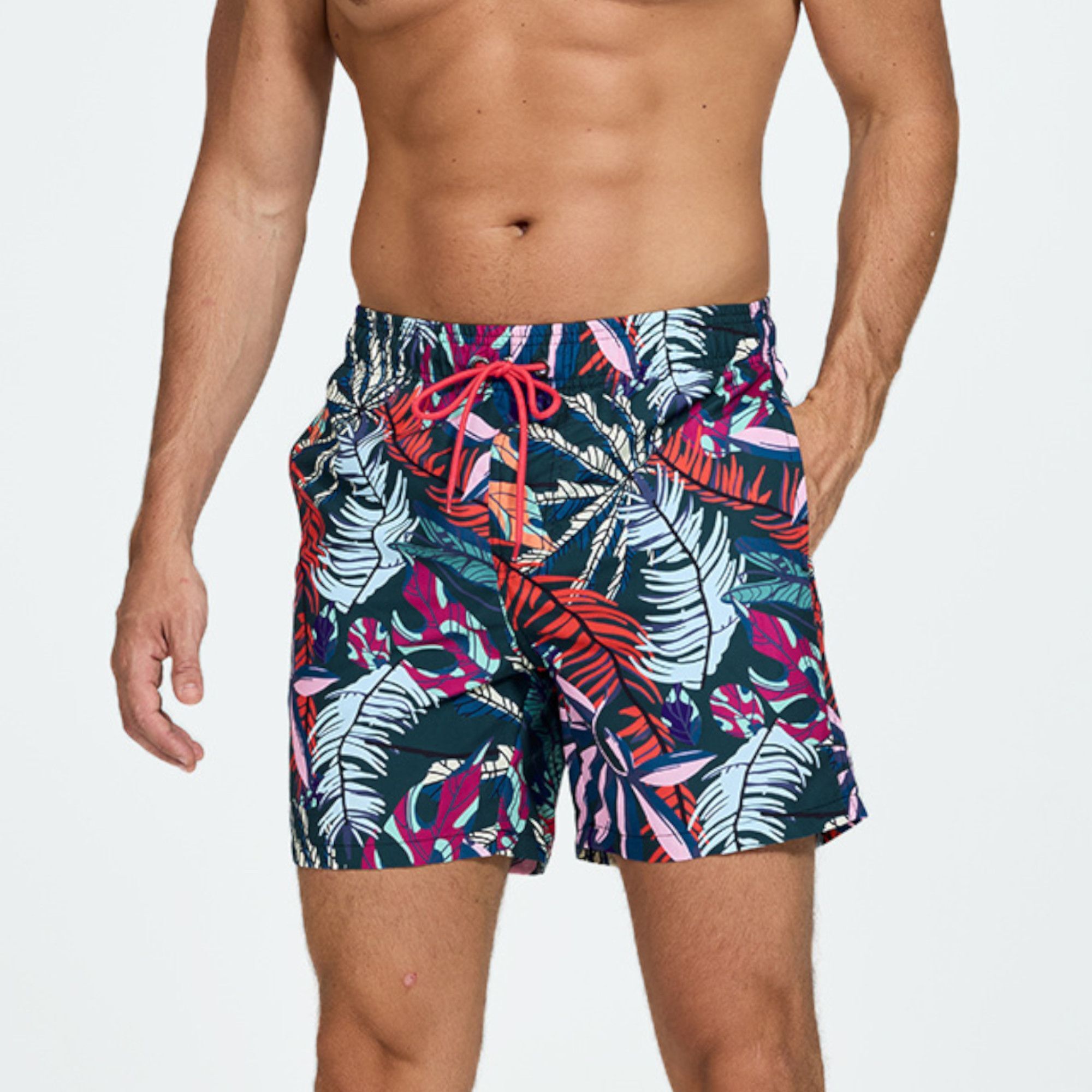 Размер: XXL (соответствует российскому размеру 54). Цвет: темно-серый с принтом в зеленых, розовых и голубых тонах. Длина стандартная для пляжных шорт.
