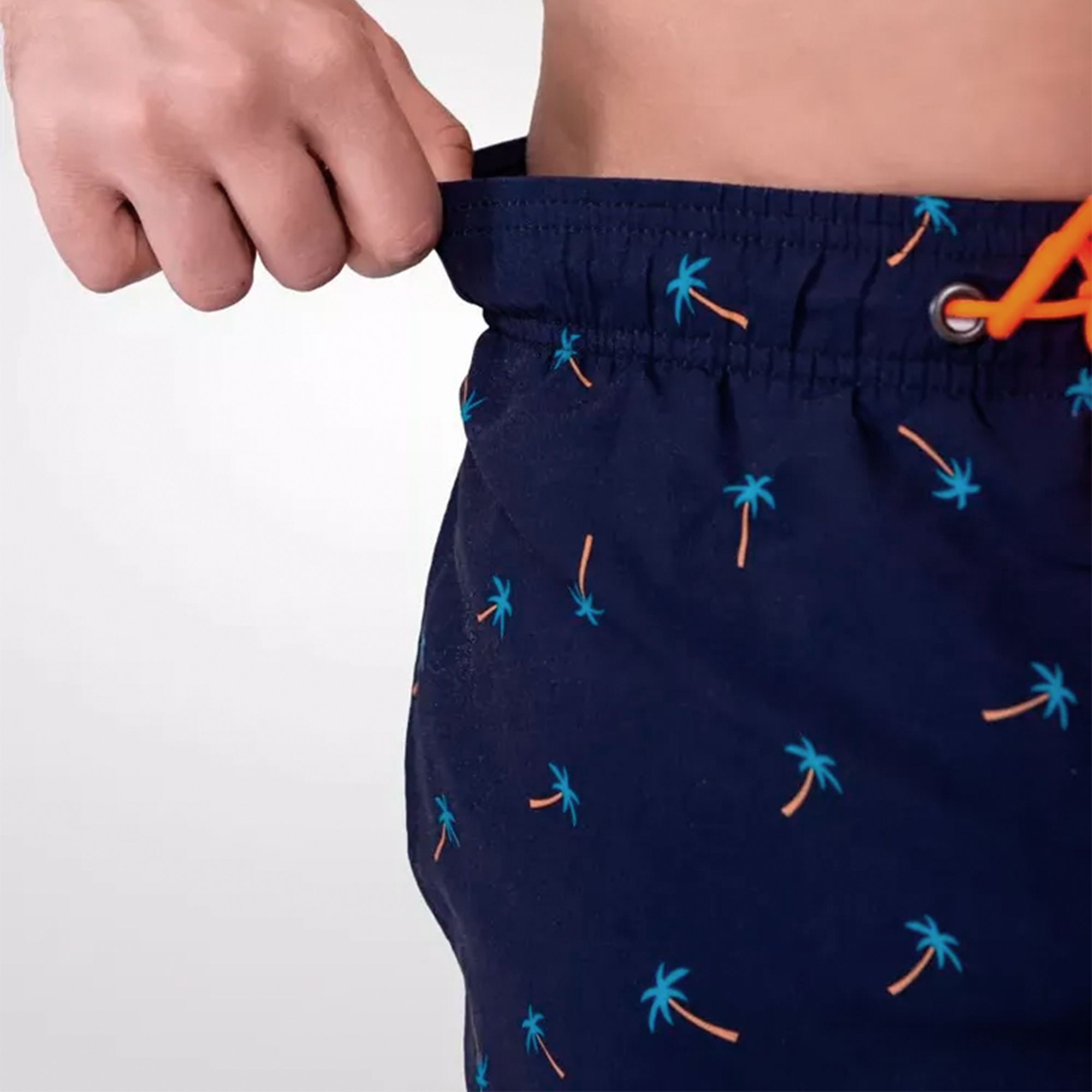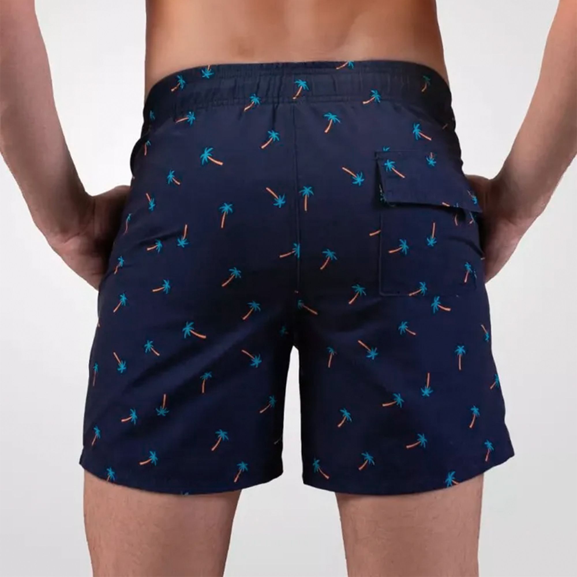Мужские пляжные шорты с принтом пальм созданы для отдыха без лишних забот. Легкая ткань и удобный крой позволяют чувствовать себя уверенно на пляже, в бассейне или во время прогулки по набережной. Темно-синий цвет с контрастным рисунком делает образ выразительным и аккуратным.