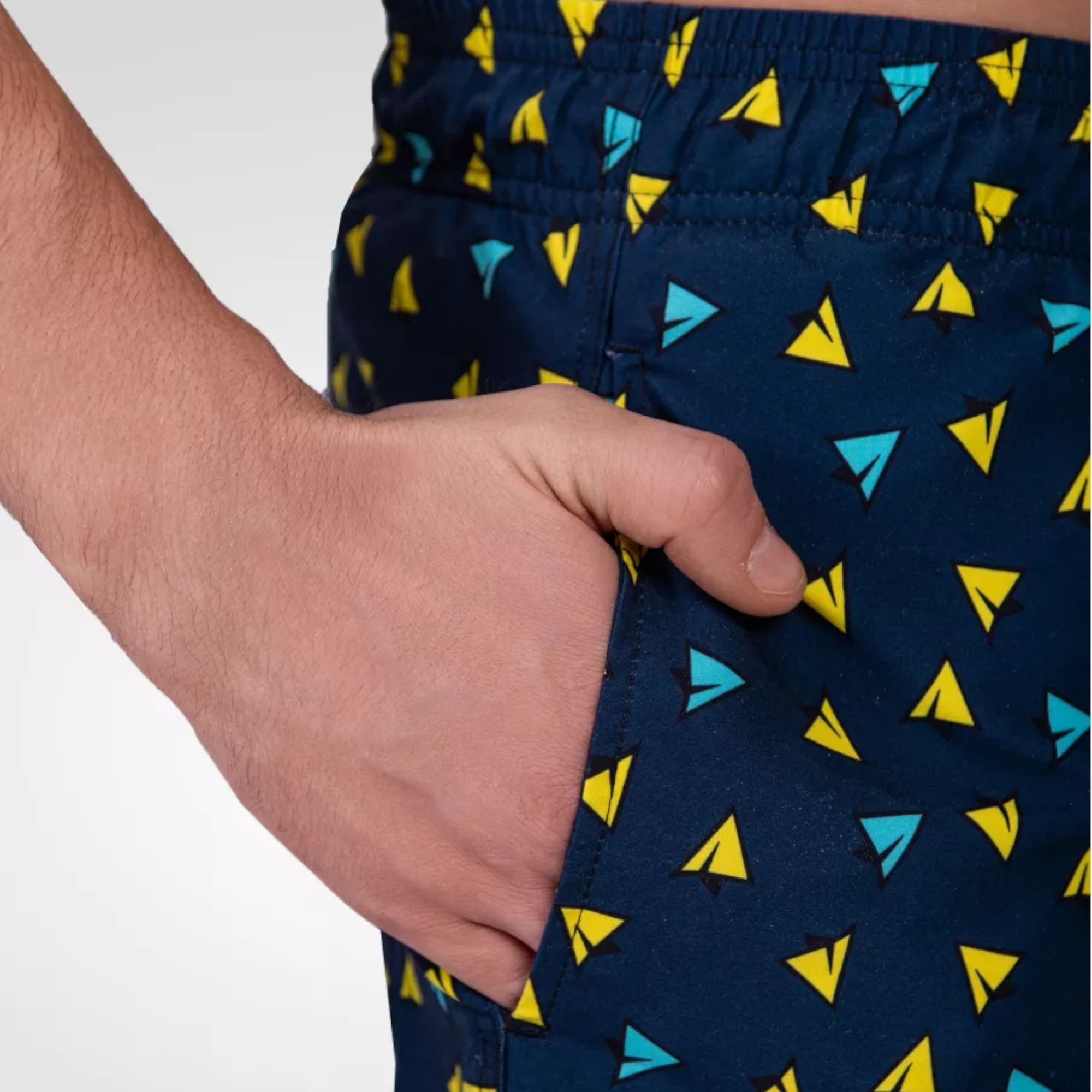 Эти мужские пляжные шорты выполнены из легкого и быстросохнущего материала, идеально подходящего для пляжа, бассейна или прогулок в теплую погоду. Благодаря яркому принту с треугольниками и практичным боковым карманам, они гарантируют комфорт и удобство в ношении. Шорты удобно сидят благодаря эластичному поясу и белому шнуру, позволяют свободно двигаться и выглядеть стильным в любой ситуации.