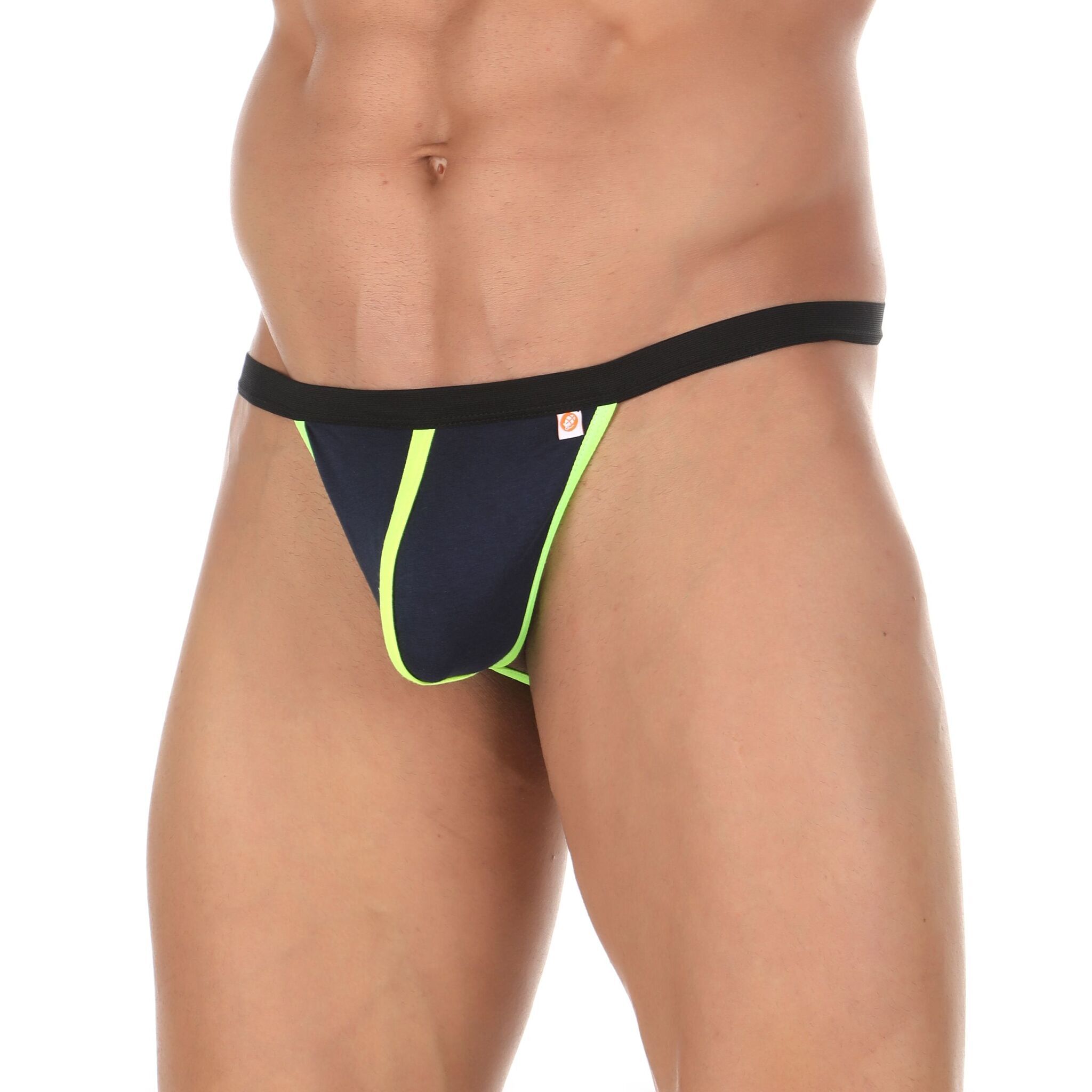 Трусы-стринги мужские сексуальные, темно-синие с салатовой окантовкой, размер S, хлопок/эластан, "Wonderboom"