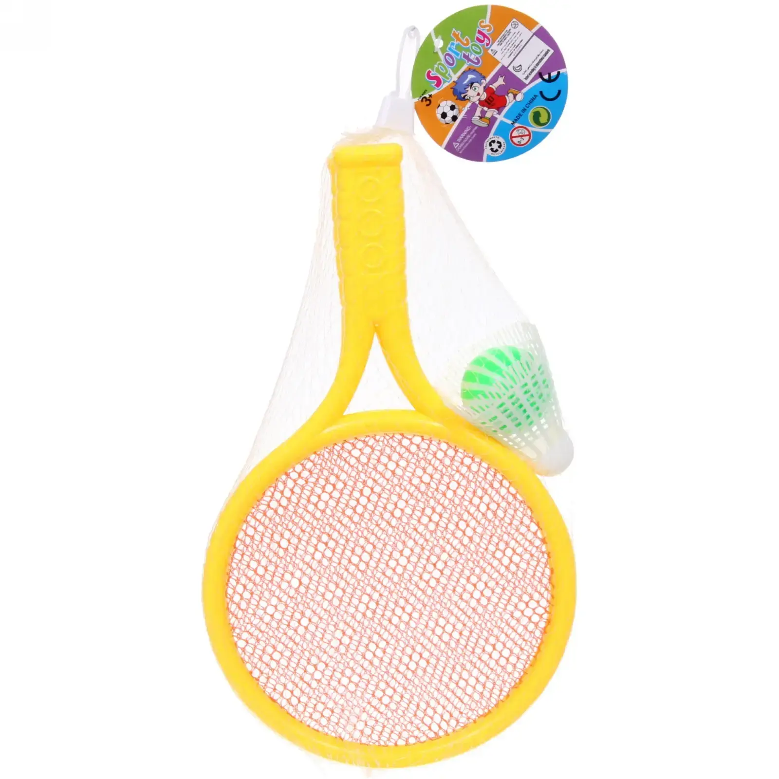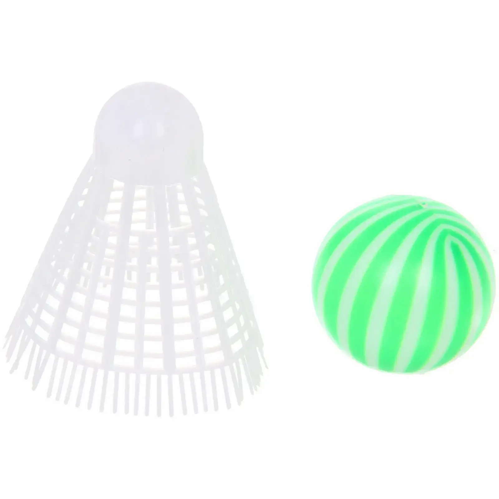 Ракетки имеют округлую форму с сеткой, выполненной из красной нити, что добавляет эстетики и функциональности. Шарик и волан также выполнены из качественных пластиковых материалов, что гарантирует их долговечность. Набор упакован в сетку, что удобно для хранения и транспортировки.