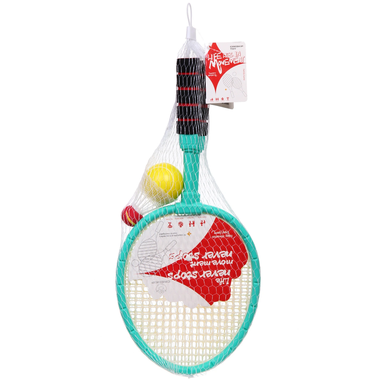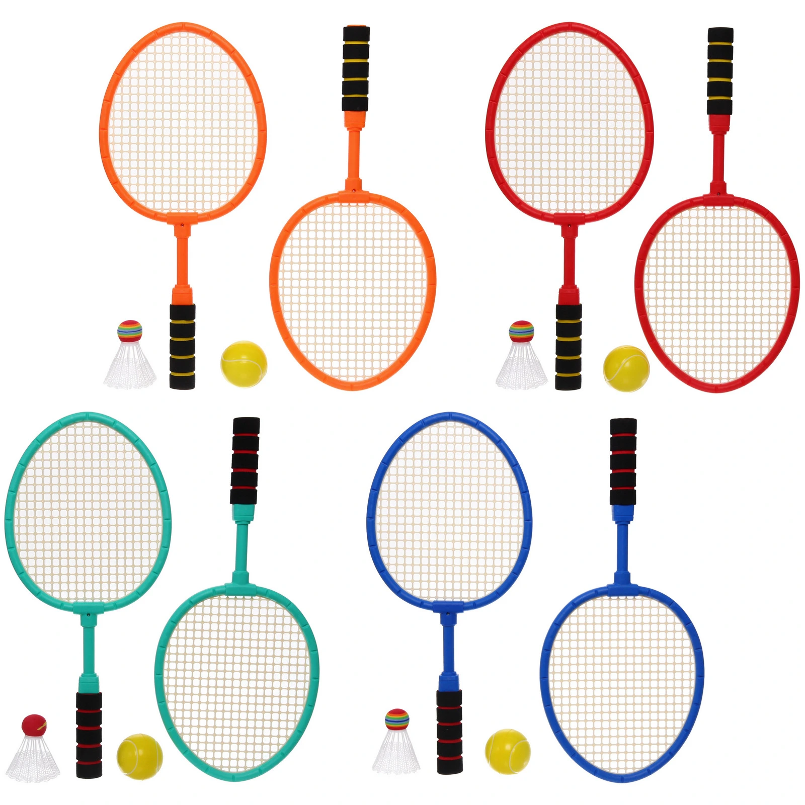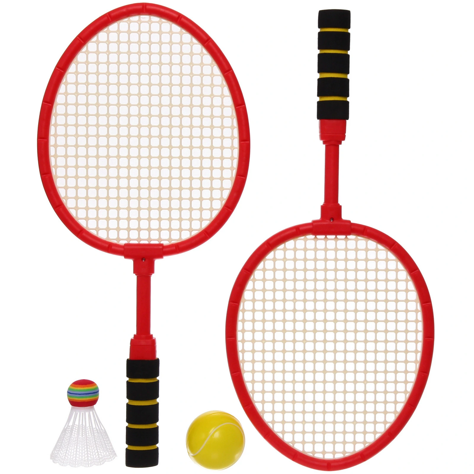 Ракетки выполнены из пластика с сетчатой рабочей поверхностью и эргономичными ручками. В комплект входят 2 ракетки размером 47x21 см, один мяч и один волан. Набор представлен в нескольких цветах: отгружается один комплект, цвет определяется случайным образом из доступных вариантов.