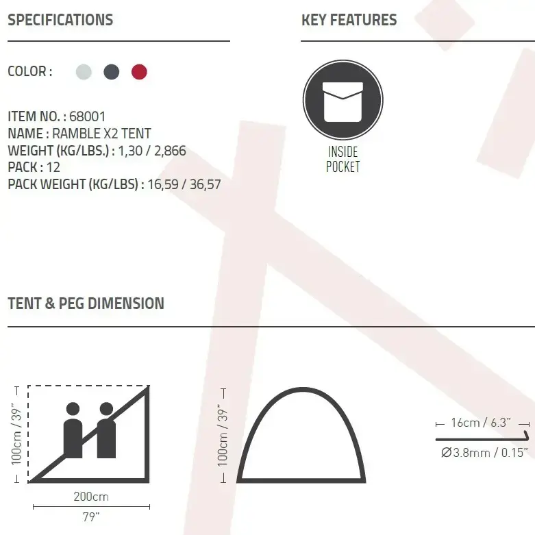 Палатка Ramble X2 имеет размеры 200 см в длину, 100 см в ширину и 100 см в высоту. Она выполнена из полиэстера 170T, что гарантирует долговечность и надежность. Пол палатки изготовлен из ПЭ плотностью 110 г/м², что обеспечивает дополнительную защиту от влаги. В комплект входит палатка и сумка для переноски, что делает ее удобной для транспортировки.