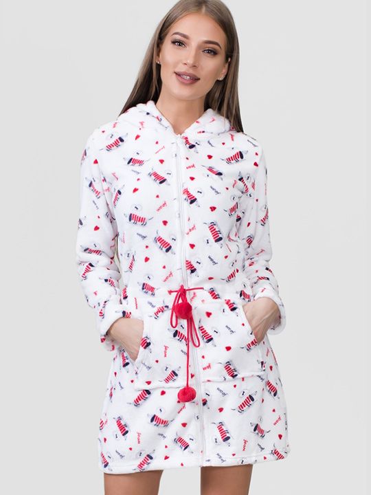 Халат женский тёплый на молнии с капюшоном, принт "таксы", белый, размер M, 100% полиэстер