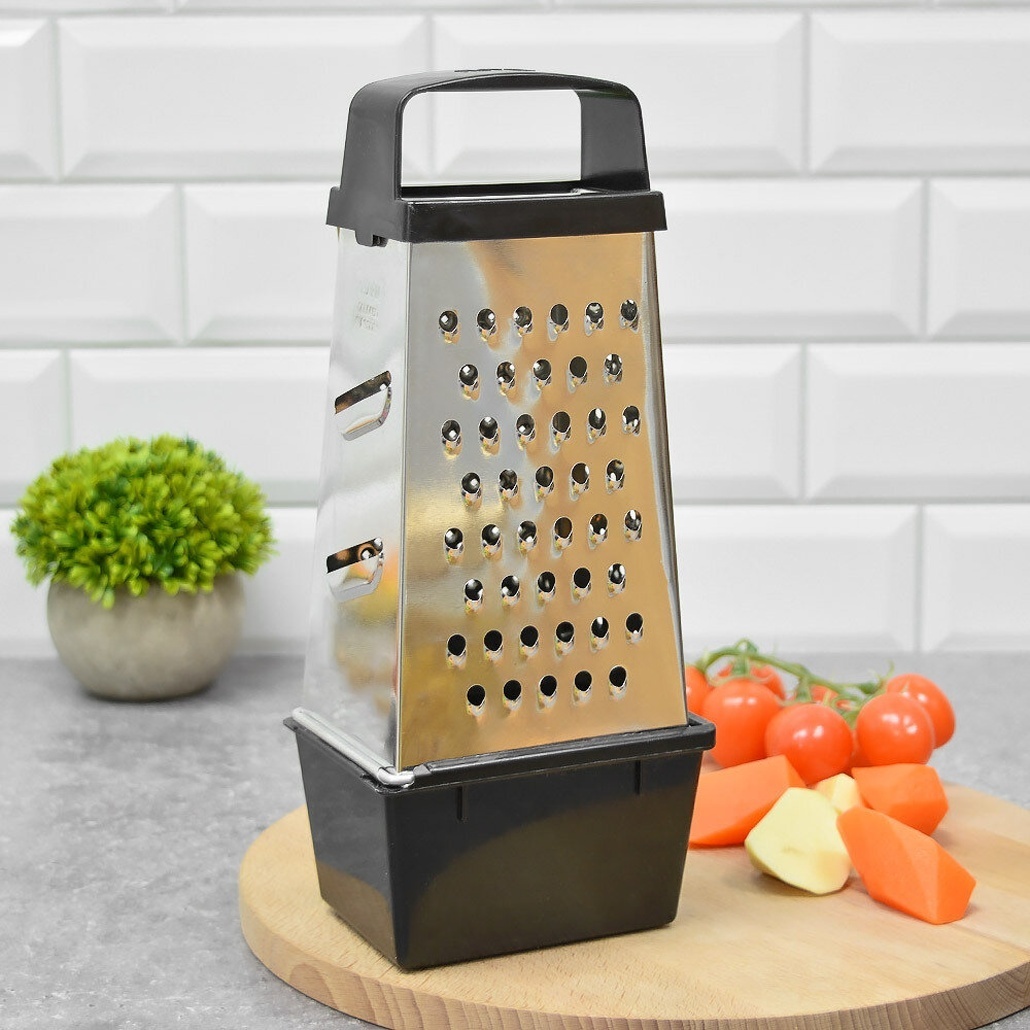 Металлическая терка с контейнером превращает приготовление пищи в удовольствие. Четыре рабочие поверхности и продуманная конструкция экономят время на кухне, а встроенный контейнер сохраняет аккуратность рабочего пространства.