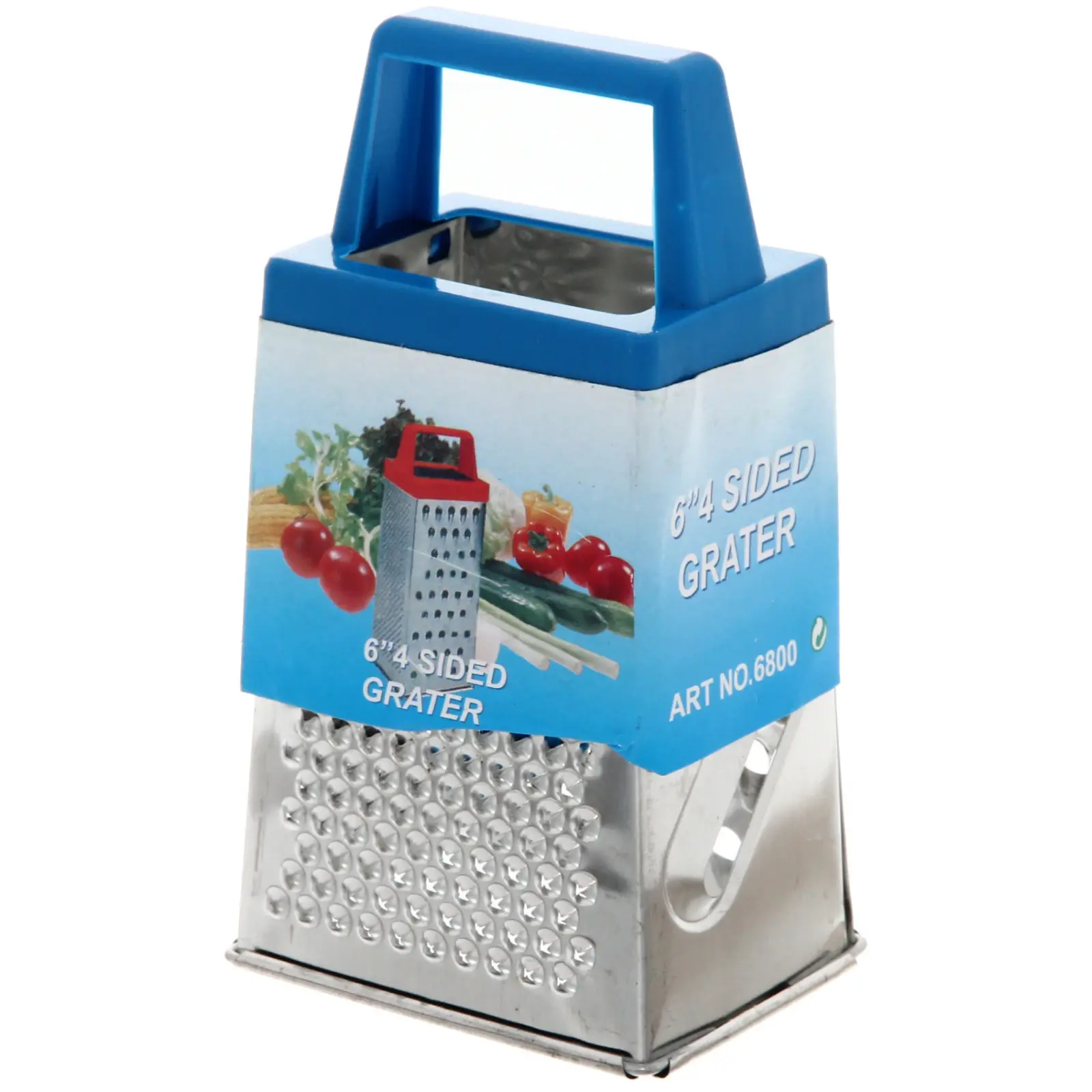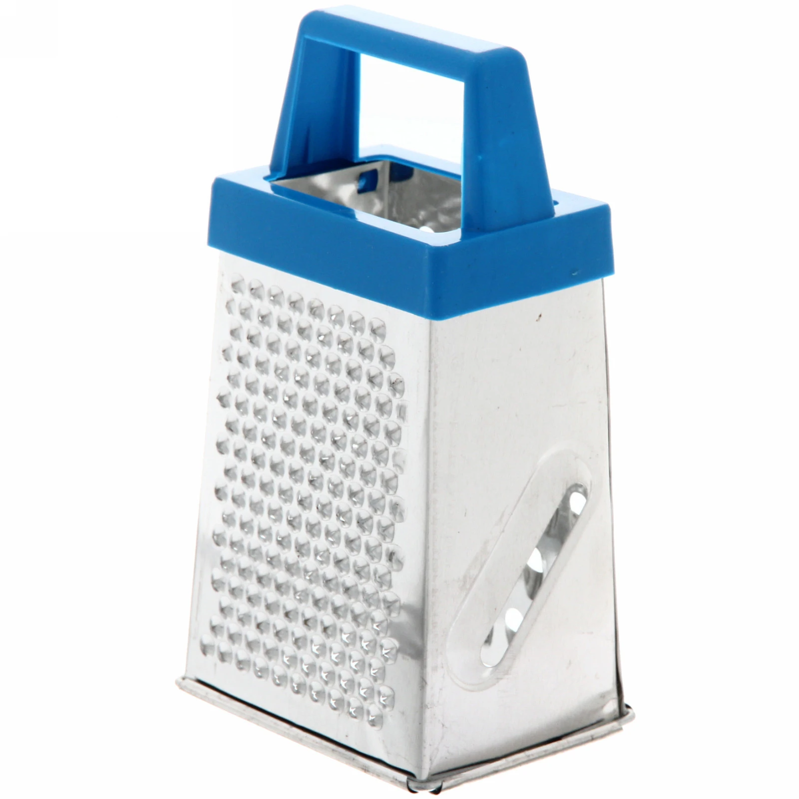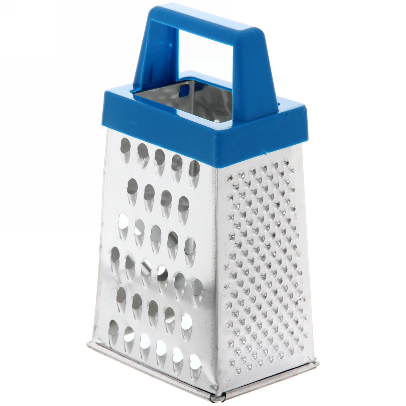 Терка имеет четыре стороны с различными отверстиями, что позволяет использовать ее для натирания продуктов разной текстуры. Она идеально подходит для нарезки овощей, таких как морковь, огурцы и помидоры, а также для сыра. Удобная пластиковая ручка синего цвета обеспечивает надежный захват и комфорт при использовании.