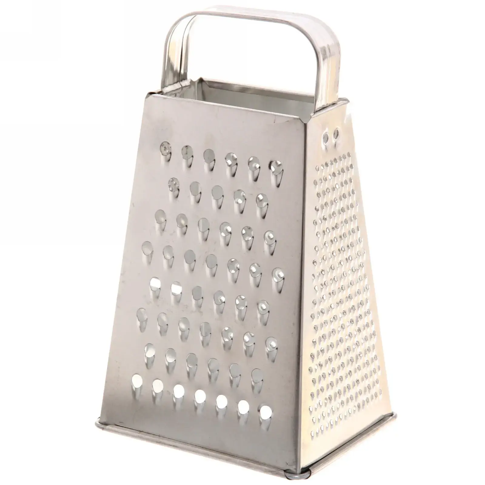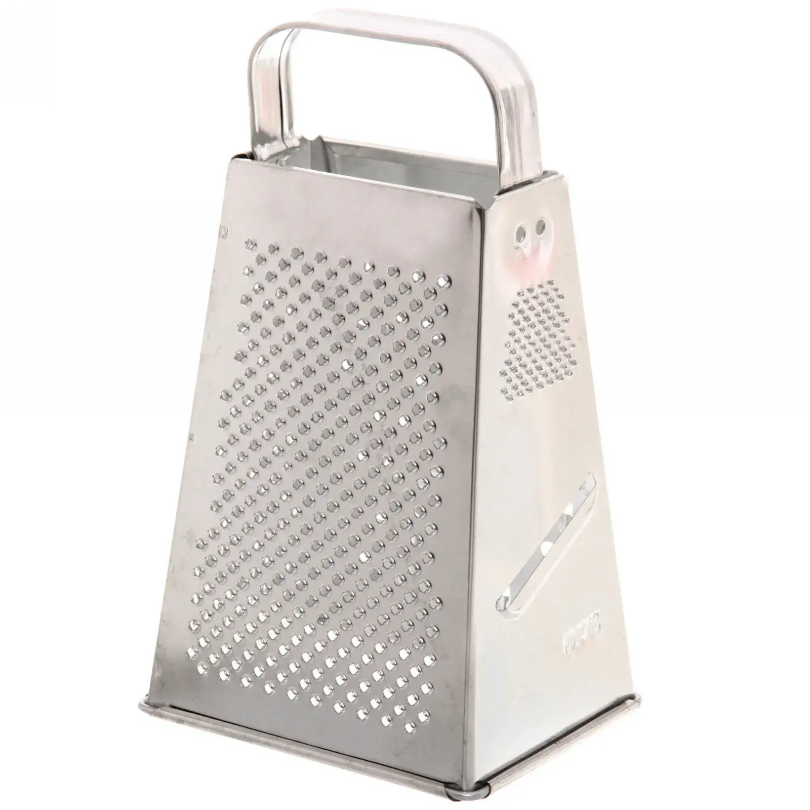 Терка имеет 4 стороны с отверстиями различного размера, что позволяет использовать её для натирания, нарезки и измельчения. Удобная ручка обеспечивает надежный захват, а устойчивое основание позволяет безопасно устанавливать терку на поверхности во время работы. Она идеально подходит как для домашних кулинаров, так и для профессиональных поваров.