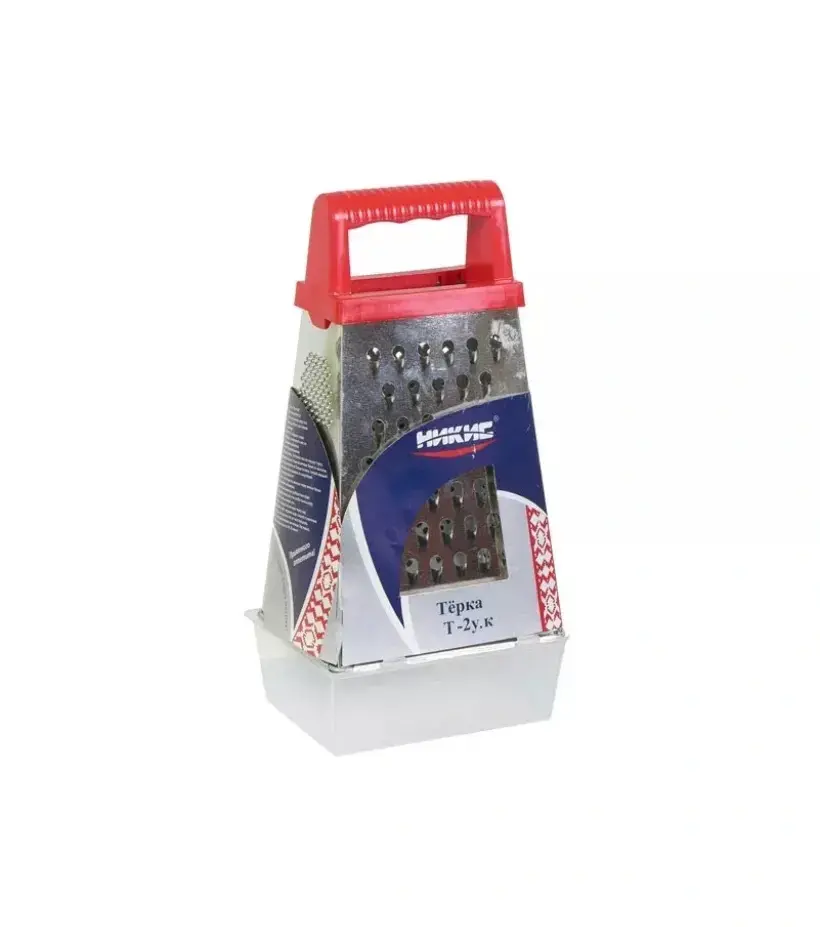 Терка имеет 4 стороны с отверстиями разного размера, что позволяет натирать продукты на ваш вкус — от мелкой стружки для сыра до крупных кусочков для салатов. Она подходит для использования как дома, так и в профессиональных кухнях. Пластиковый контейнер внизу собирает натертые продукты, что упрощает процесс уборки и экономит ваше время.